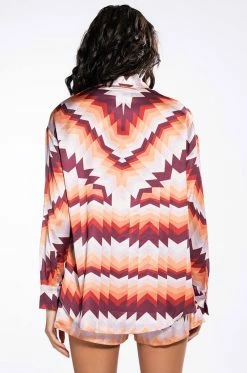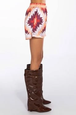 The AKIRA Label Adventurer Loose Fit Button Up And Shorts Set is made from a textured, lightweight fabrication with a multicolor, Western-inspired star print and features: a loose fit button up shirt with a pointed collar neckline, long sleeves with buttoned cuffs, split hems, and a button up front closure. Also included is a pair of loose fit shorts with a high rise waist, a ruched drawstring waistband, and side pockets.
