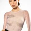 Cut the lights and turn up the heat. The AKIRA Label After Dark Faux Leather Panel Long Sleeve Mesh Bodysuit is an ultra-sexy sheer top featuring a mesh base, long sleeves, a high cross front neckline, and a thong bottom fit. Complete with a snap gusset fastening and faux leather panel detailing across the chest. Complete your look with straight leg leather pants.