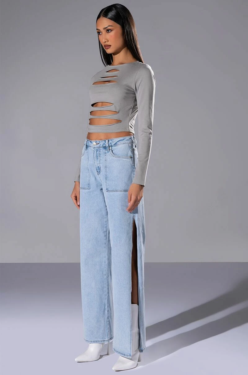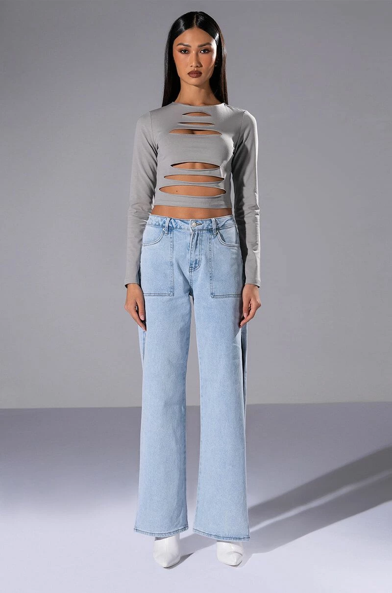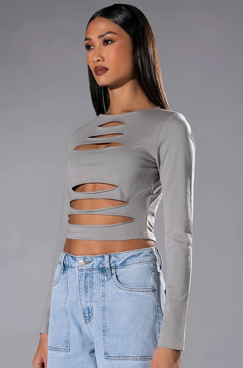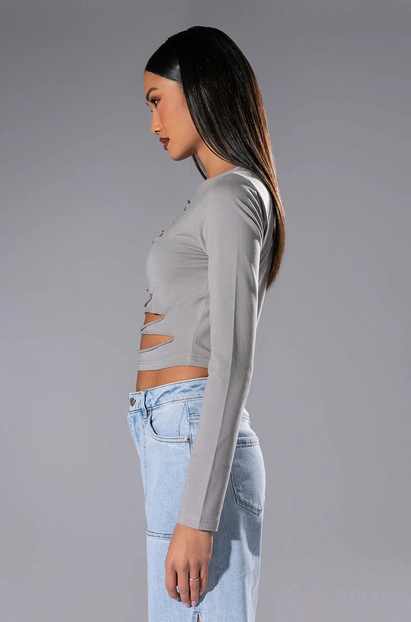 Add an extra edge to your fit with The AKIRA Label Alani Cut Out Long Sleeve Crop Top! This cropped top comes in a soft and stretchy fabrication, and is complete with sexy slits and cuts at the front, long sleeves, and a crew neckline. Complete this look with your fave denim, moto jacket, and a pair of platform pumps!