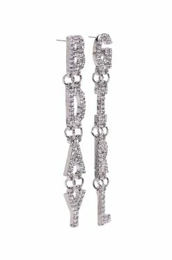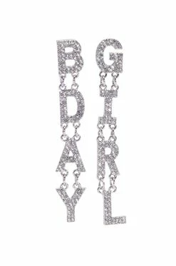 The AKIRA Label All Eyes On Me Rhinestone Drop Earrings are made from a faux silver metal base and feature a drop silhouette with linked pave rhinestone letters spelling out “Bday” on one ear and “Girl” on the other. Complete with post back fastenings.