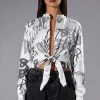 Give them something to look at with The AKIRA Label All Eyes On You Button Down Blouse! This bold piece is made from a lightweight cotton shirt fabrication and features an artsy faces print, a pointed collar, long sleeves with cuffed wrists, a rounded hem, mini length silhouette, and a button down front closure. Pair this piece with thigh high boots, denim, and a moto jacket to complete your graphic look.