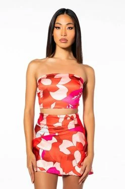 The AKIRA Label All Me Printed Bandeau Top is a satin strapless piece featuring a straight across neckline, an ultra cropped silhouette, an open back, and triple back strap detailing. Pair this piece with the matching AKIRA Label All Me Mini Skirt to complete your look.
