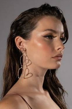 The AKIRA Label All My Lovin Rhinestone Dangle Earrings feature a rose gold metallic base, a dangle silhouette, and linked pave rhinestone -embellished hearts. Complete with post back fastenings.