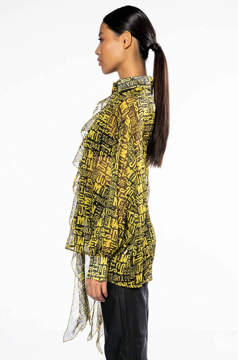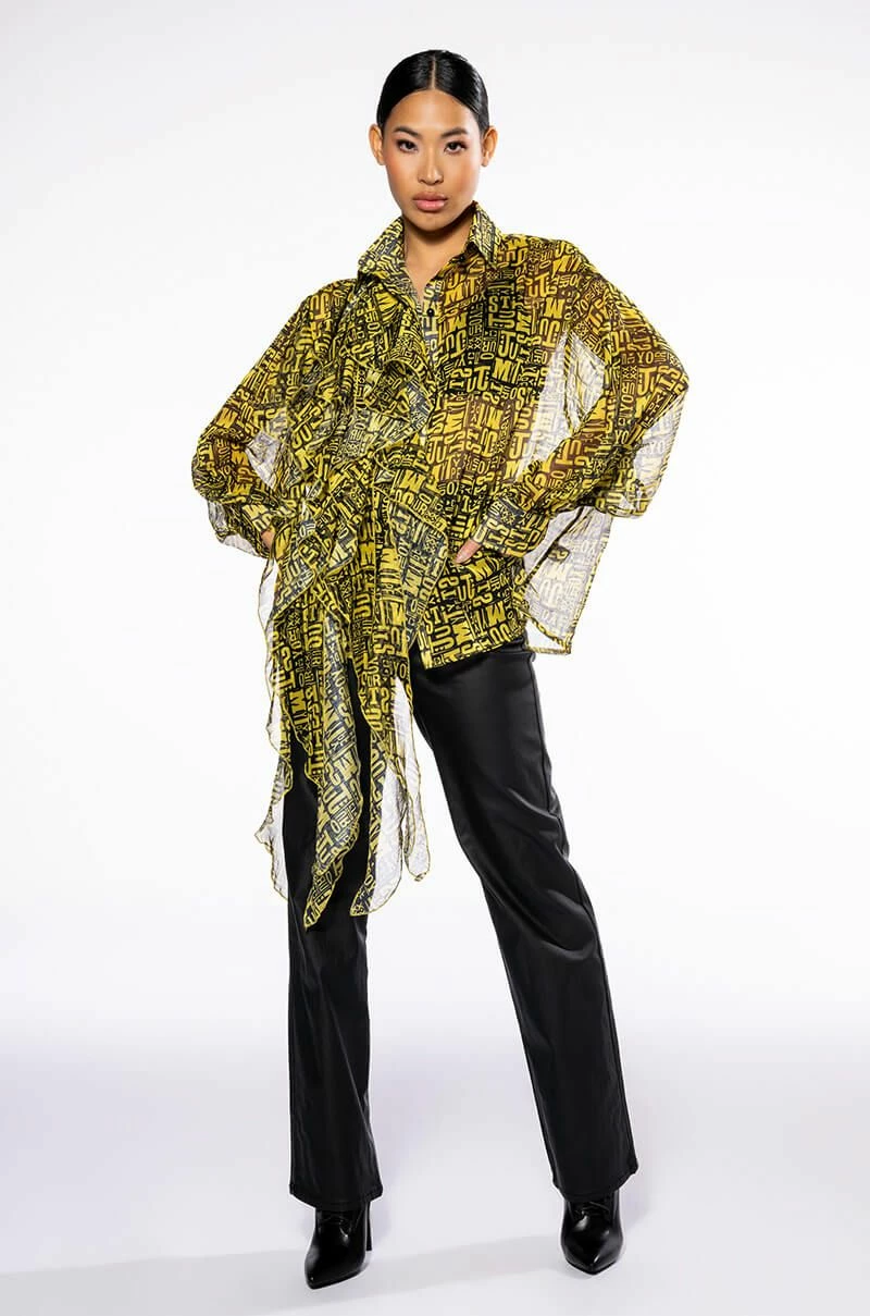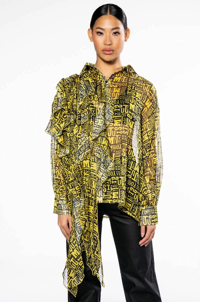 The AKIRA Label Pure Love Asymmetrical Ruffle Button Down Blouse is made from a sheer, lightweight fabrication and features a clustered text and heart print, a collared neckline, long sleeves with buttoned cuffs, a boxy silhouette, and extended asymmetrical ruffle detailing on the right side. Complete with a button down front closure. Pair this piece with leather-look leggings and platform booties to complete your look.