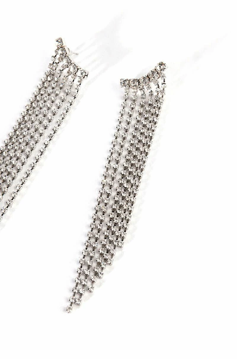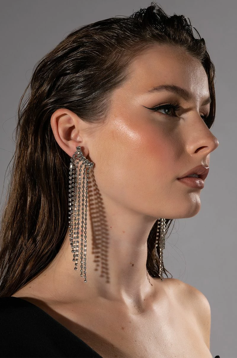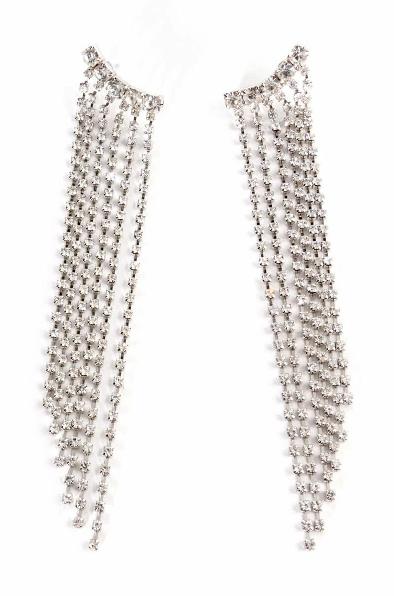The AKIRA Label All That Glitters Cascading Rhinestone Earrings feature a silver metallic base, a dangle silhouette, and asymmetrical rhinestone link fringe.. Complete with post back fastenings.