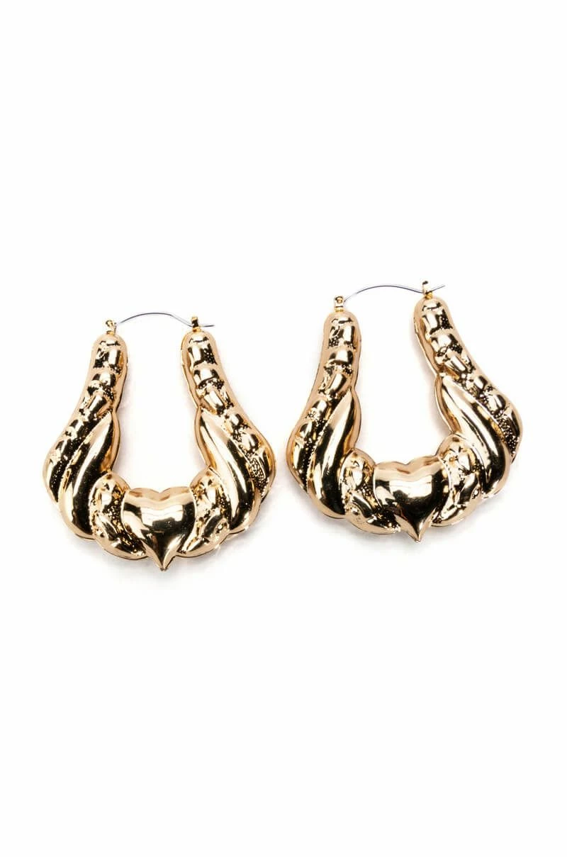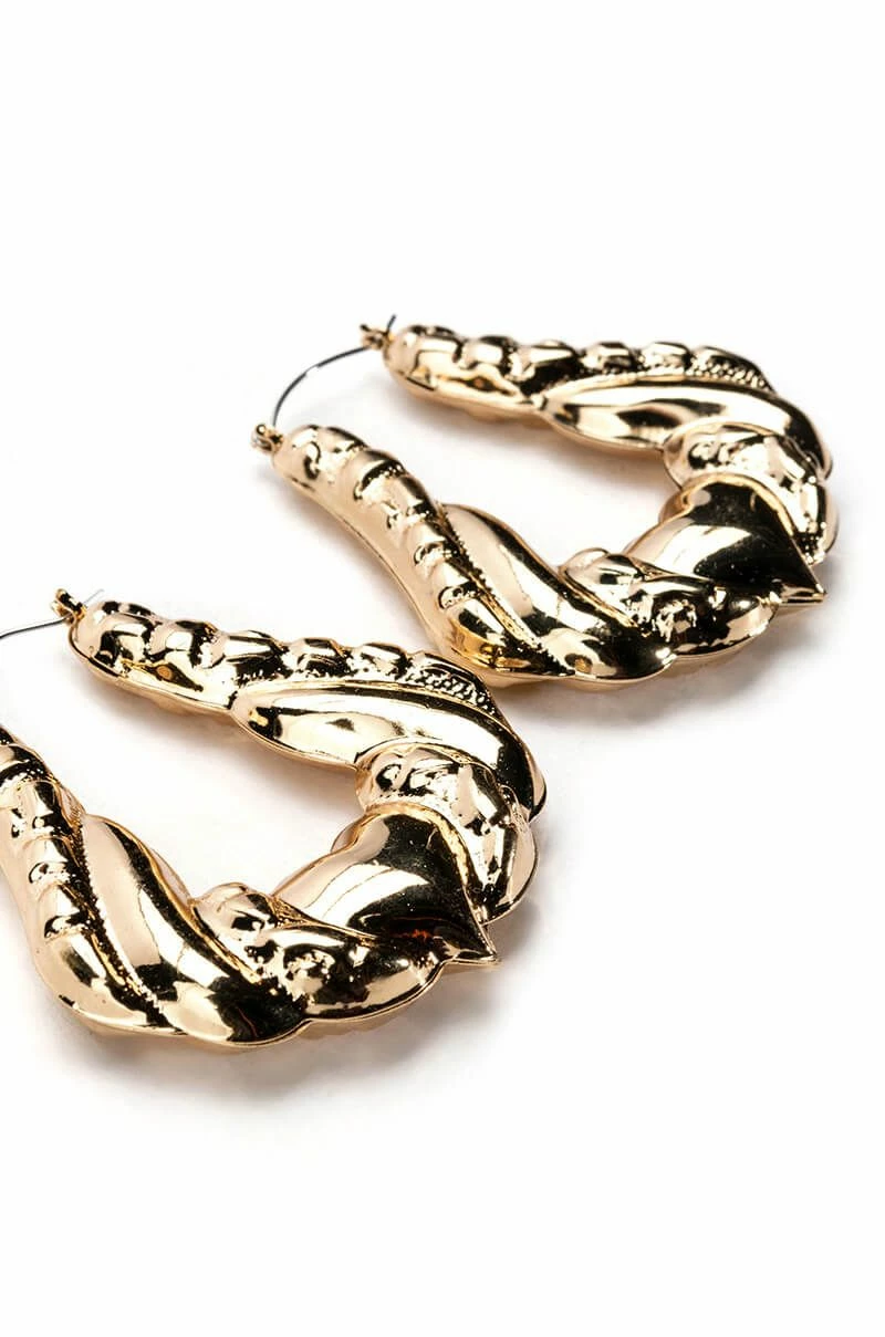 The AKIRA Label All That Jazz Hoops are a set of door knocker hoops made from a faux gold metal base featuring a textured design, a large hoop silhouette, heart detailing, and lever back fastenings.