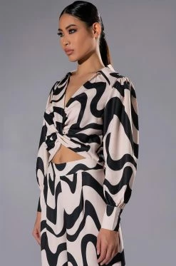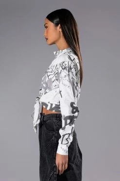 Keep them second guessing with The AKIRA Label Always In Style Tie Front Tshirt! This top is a soft cotton tee featuring a plunging neckline, long sleeves with ribbed cuffs, and a tie front silhouette. Complete with allover graffiti style text print and rhinestone embellished text patterning. Pair with relaxed denim and strappy heels for a sexy day out look!