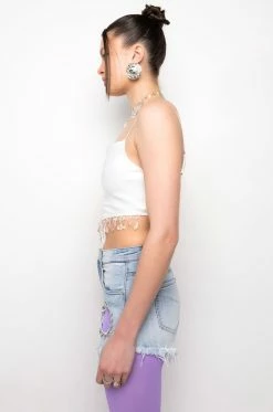 Live on Cloud 9 in The AKIRA Label Angel Babe Beaded Trim Cowl Neck Tank. This luxe satin piece features adjustable tank straps, scowl neckline, point hemline, beaded trim, and an ultra cropped cut. Pair this top with leather look leggings and lace up stiletto sandals for an angelic ensemble