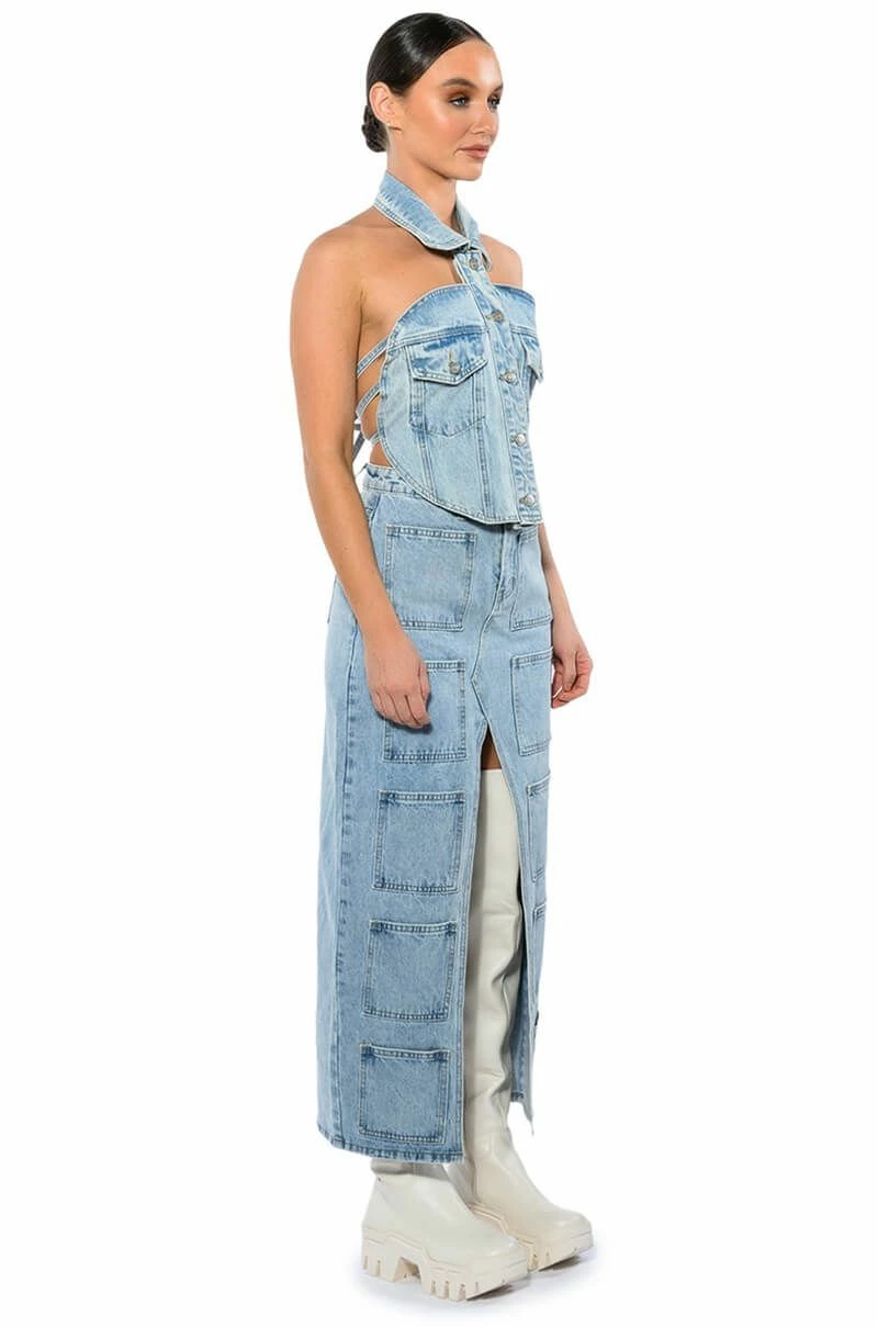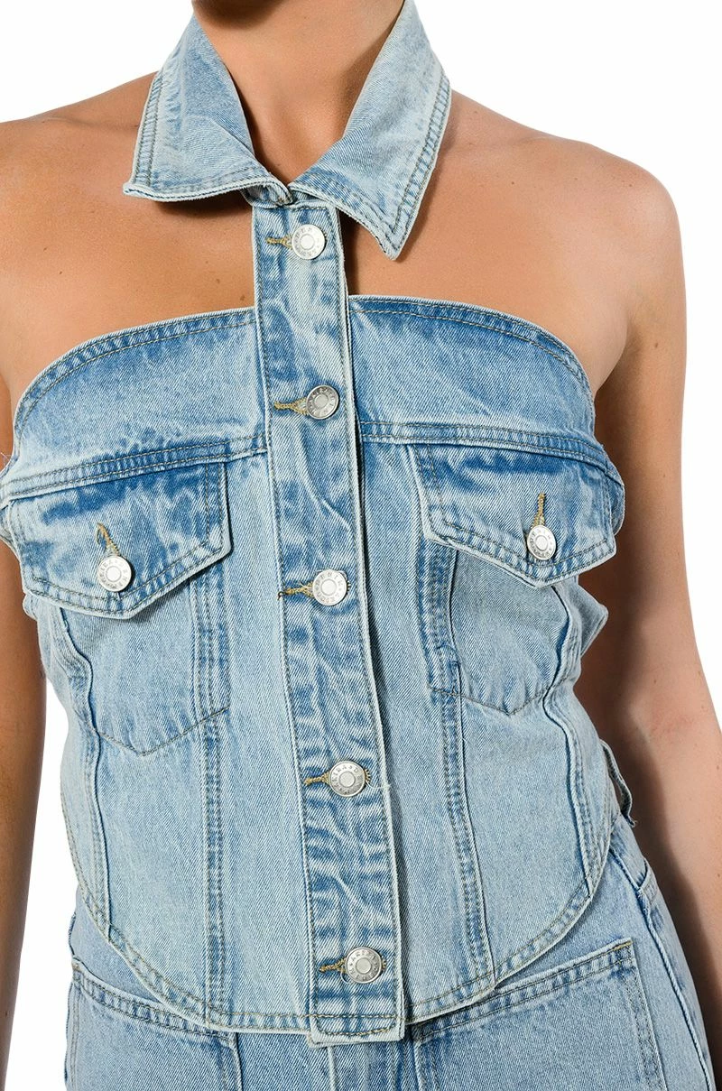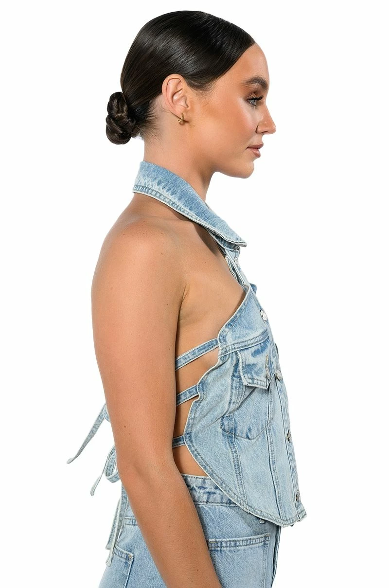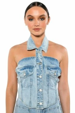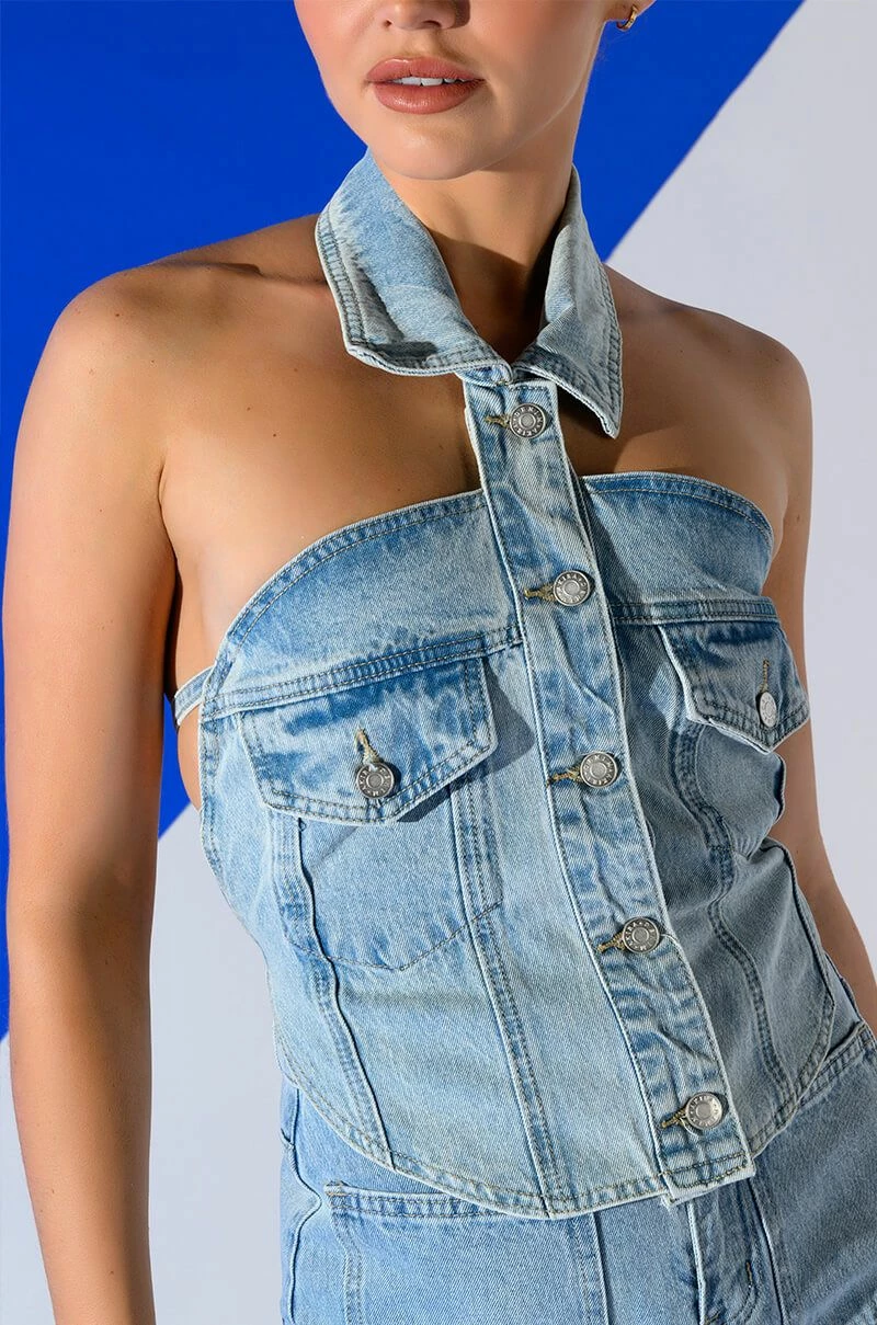 The AKIRA Label Angelica Denim Button Down Collar Corset Top is made from a structured washed denim and features a collared neckline, a sleeveless silhouette, button flap chest pockets, a rounded hem, button down front closures, and a strappy open back with denim ties. Pair this piece with the matching AKIRA Label Angelica Denim Midi Open Slit Skirt to complete your look.