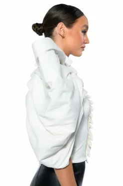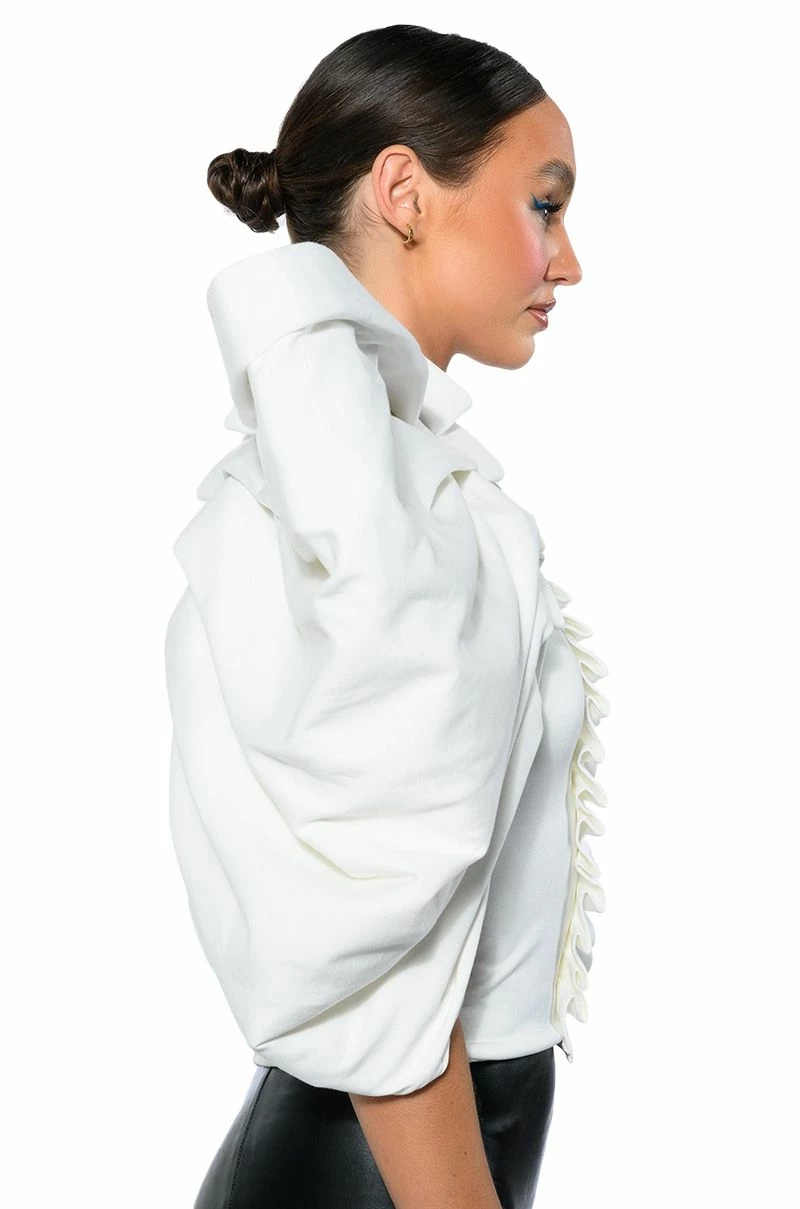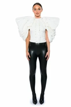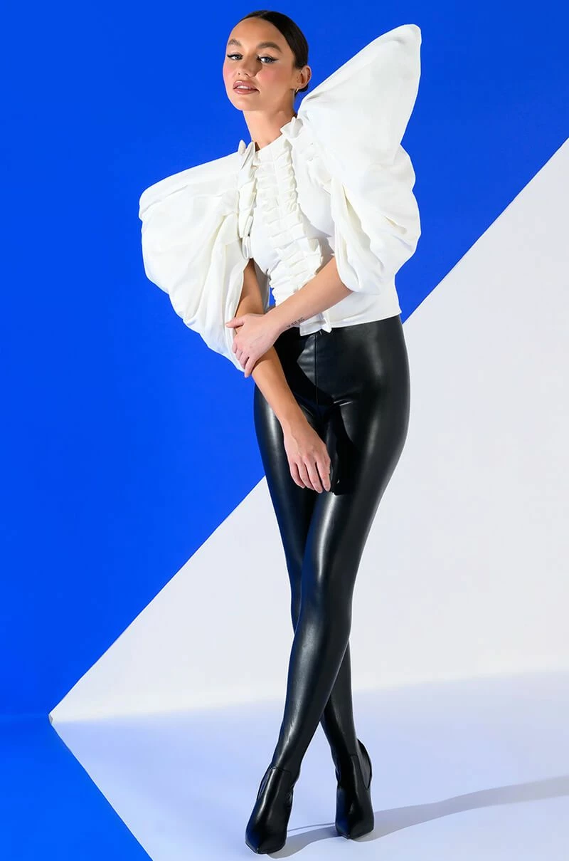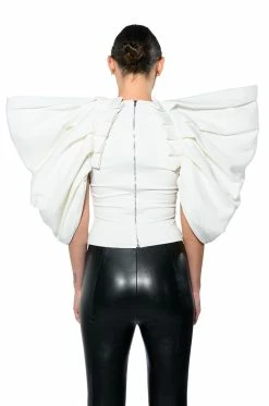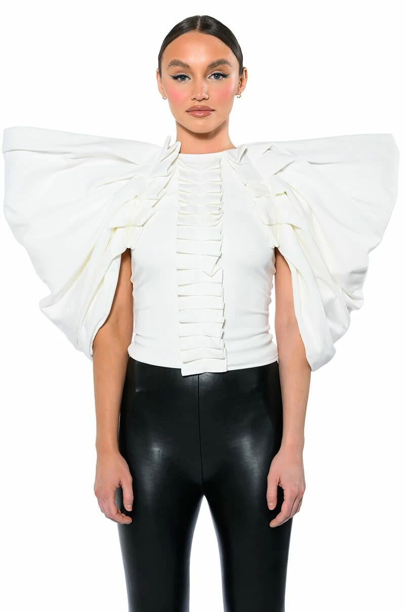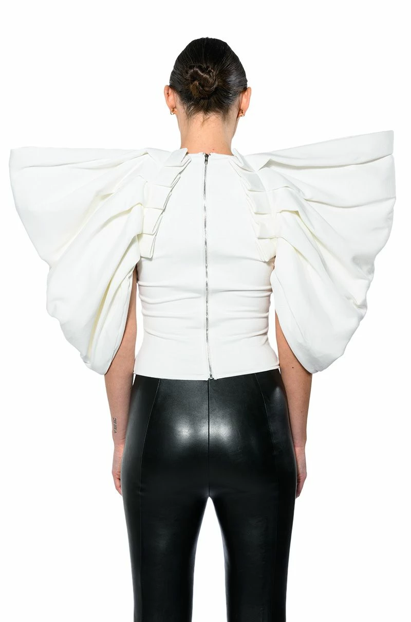 The AKIRA Label Annika Statement Sleeve Top is made from a soft, stretchy knit fabrication and features an inner tank with a high, rounded neckline, dramatic, reinforced statement sleeves, pleated column detailing, light polyester lining, and an exposed back zipper closure. Pair this piece with fitted trousers and pumps to really stand out from the crowd.