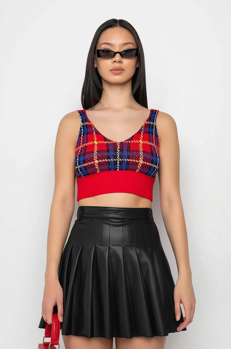 The AKIRA Label As If Crop Knit Bralette is made from a stretchy knit plaid fabrication and features tank straps, a cropped silhouette, ribbed hemline and a deep cut v neckline. Pair this cute crop with the matching AKIRA Label As If Long Sleeve Cardigan for a cozy, classy look.
