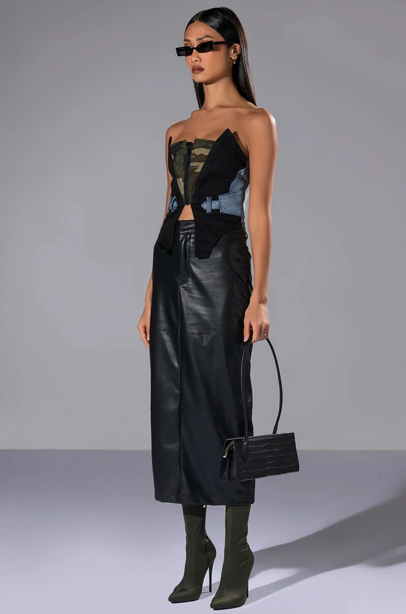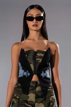 The AKIRA Label Aviator Camo And Denim Corset Top is made from a washed denim fabrication base and features a strapless, pointed neckline, cotton and camo paneling, belted bodice detailing, a cropped silhouette, extended, angular hems, and an exposed front zipper closure. Pair this piece with the coordinating AKIRA Label Aviator Camo Shorts to fly off in style.