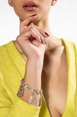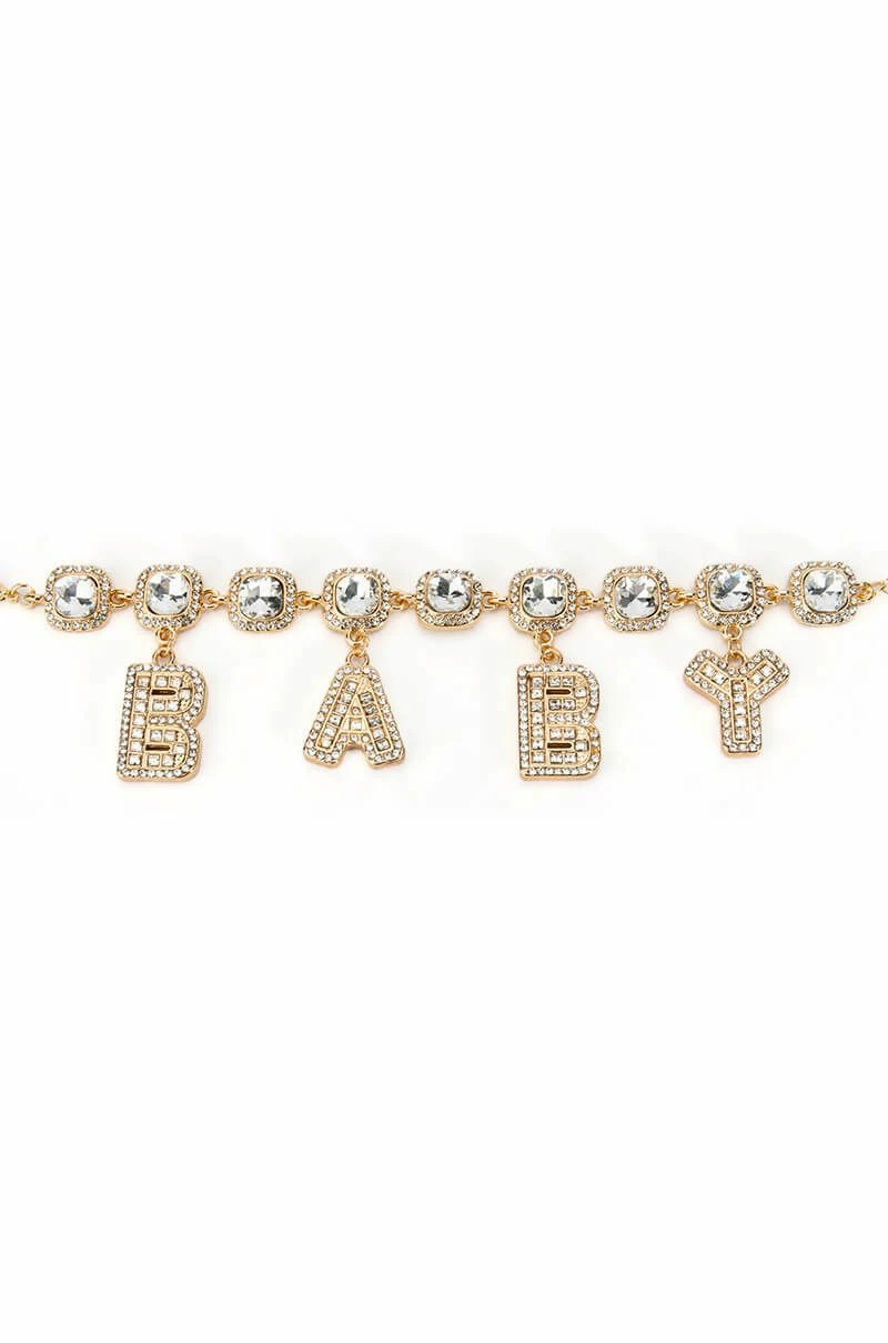 The AKIRA Label Baby Bling Rhinestone Charm Bracelet is made from a faux gold metal base and features linked square rhinestone gems with rhinestone letter charms spelling out, “BABY”. Complete with an adjustable lobster claw closure.