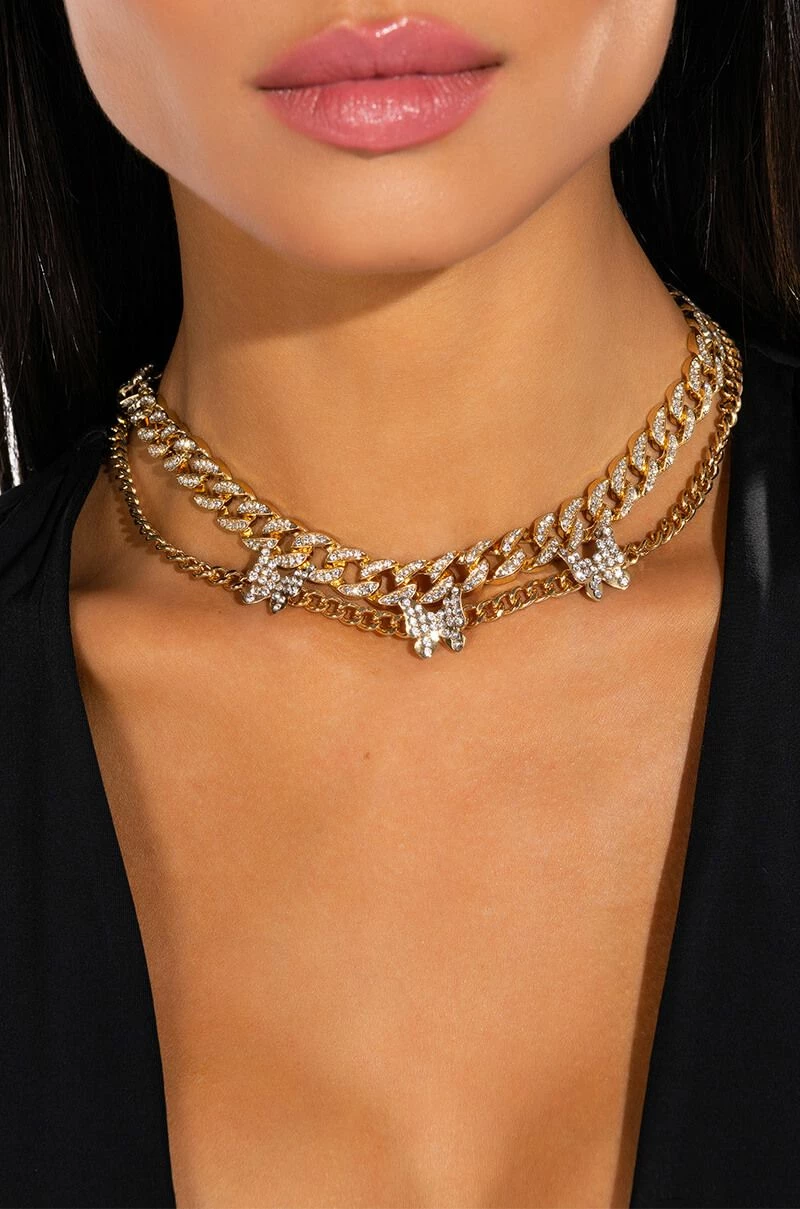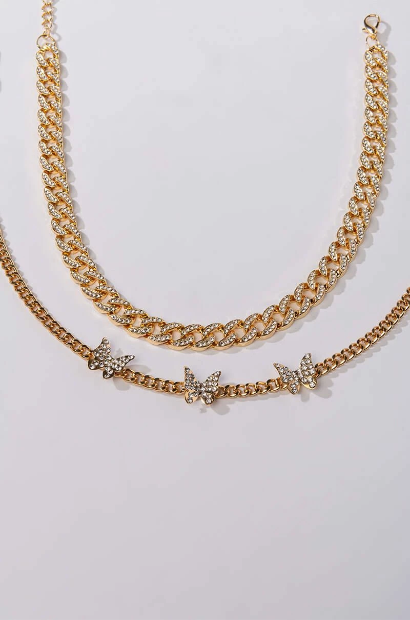 The AKIRA Label Butterfly Wings Gold Choker Necklace Set features two individual faux gold chain necklaces: one shorter pave curb chain and one longer, slimmer chain link piece with pave butterfly charm detailing. Each is complete with an adjustable lobster claw fastening. Pair with your fave oversized tees, cargo pants, and chunky sneakers.