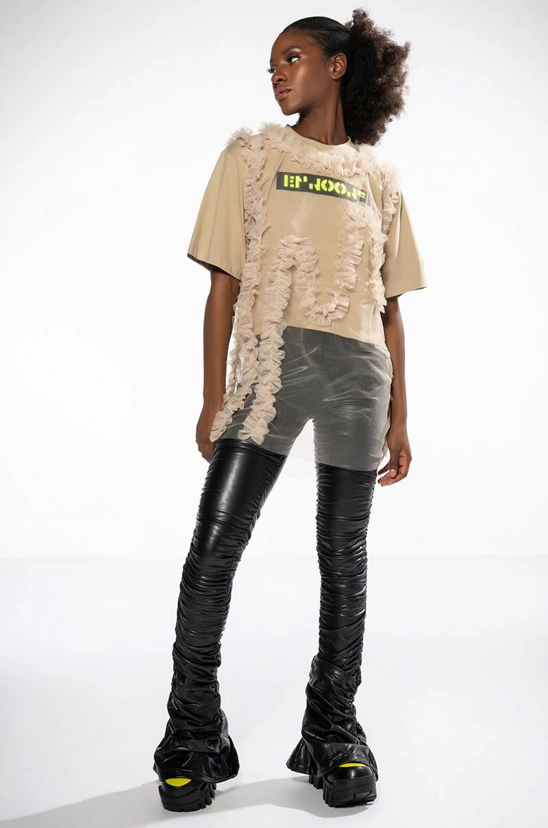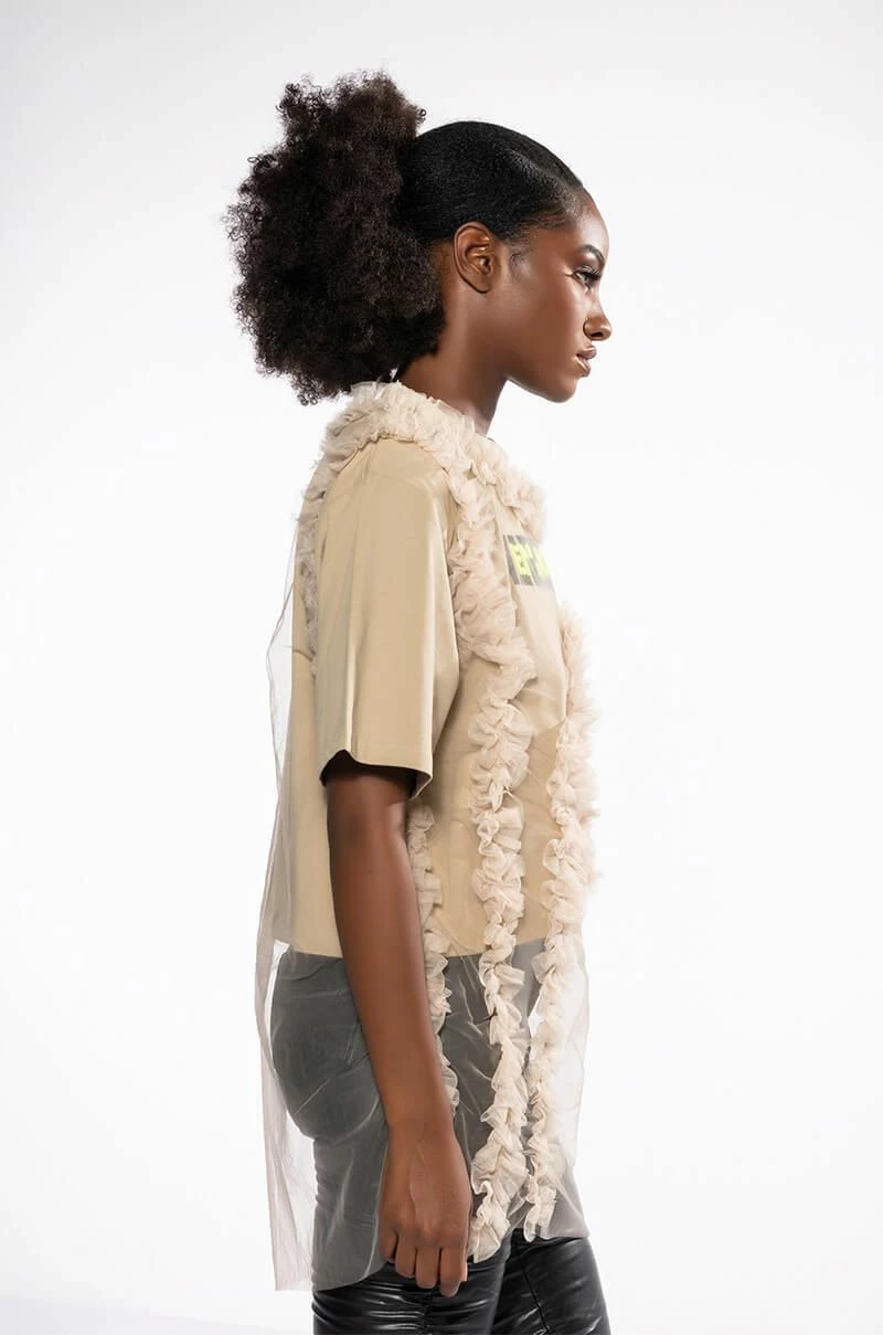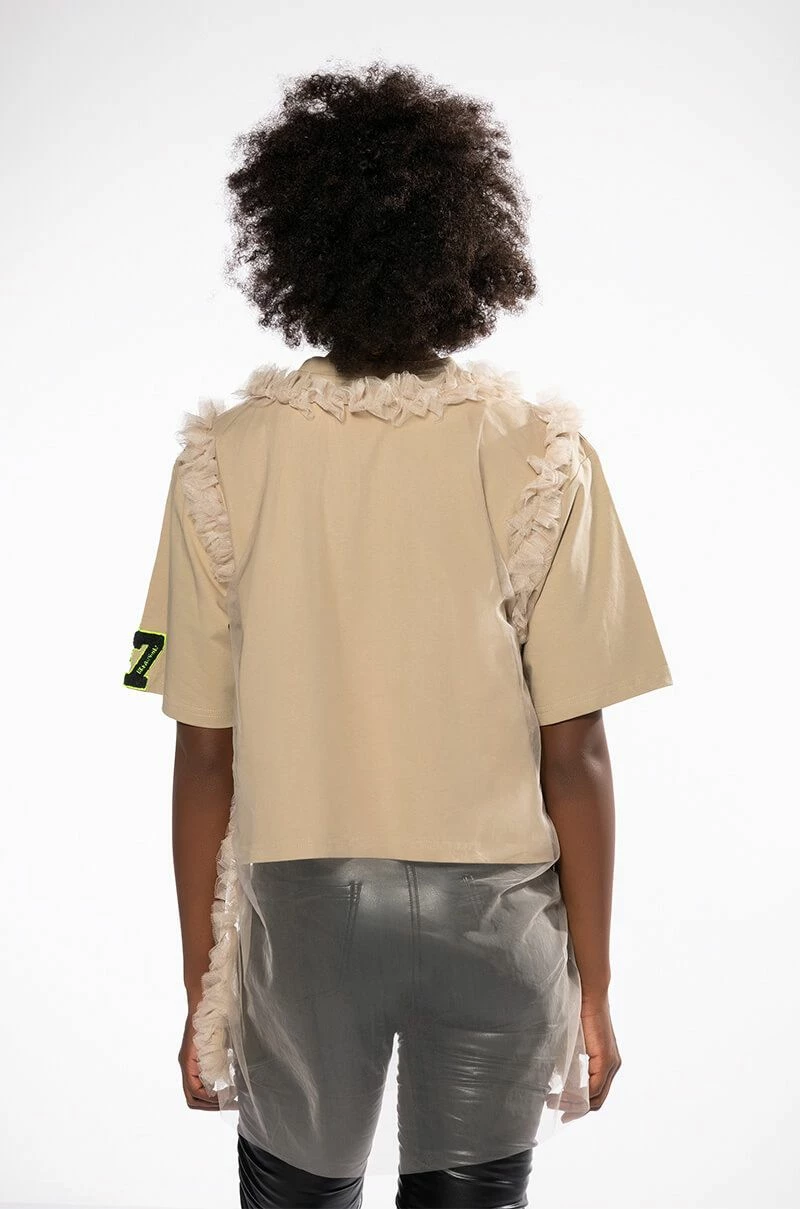 The AKIRA Label Beige Ruffle Tshirt is a classic cotton t shirt complete with a cropped cut, a crew neckline, short sleeves, and a longline tulle overlay. Complete with ruffle trim detailing and embroidered abstract text front patch accents.