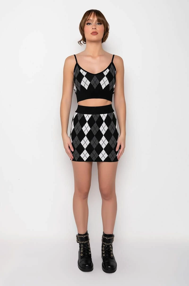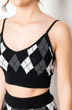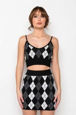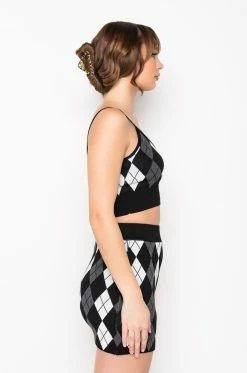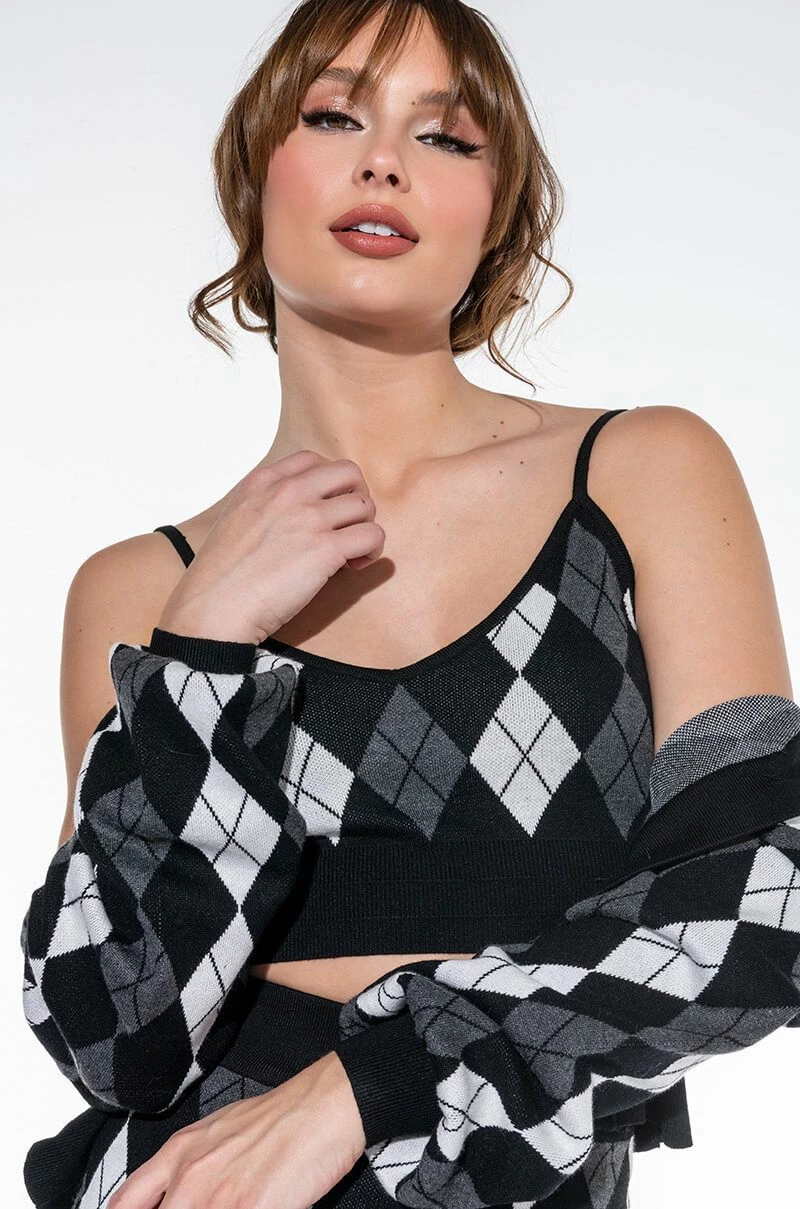 The AKIRA Label Birdie Argyle Knit Crop Top features a stretchy knit fabrication, an allover argyle print, slim spaghetti straps, a v neckline, a ribbed knit hem, and a slip on fit. Complete the look with The AKIRA Label Birdie Argyle Cropped Cardigan and Knit Mini Skirt for a cozy schoolgirl look!