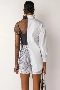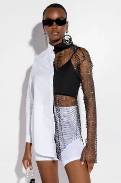 The AKIRA Label Bite Me Half Rhinestone Top is made from a mixed media fabrication and is complete with a collar, long sleeves, a half classic cotton shirt, half rhinestone netting top, an attached half a bralette top with adjustable straps, and a button up front closure.