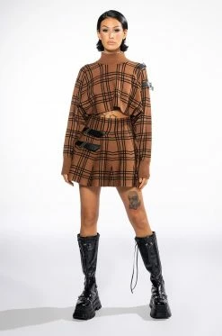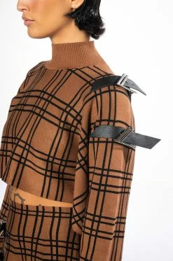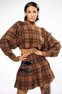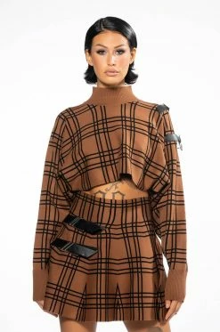 The AKIRA Label Blair Buckle Knit Long Sleeve Top is made from a soft knit fabrication and features plaid patterning, a ribbed knit mock neck, long ribbed cuff sleeves with buckle strap detailing on the left sleeve, and a cropped silhouette. Pair this piece with the matching AKIRA Label Blair Buckle Flare Skirt to complete your look.