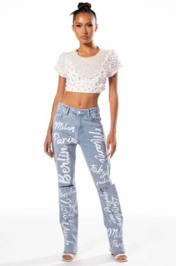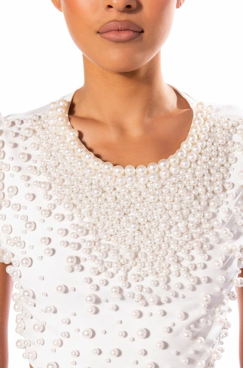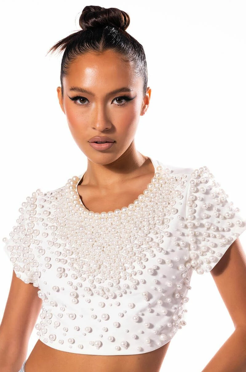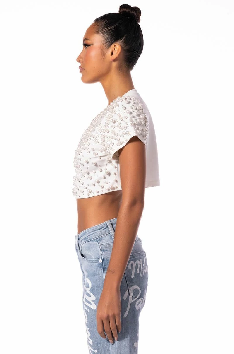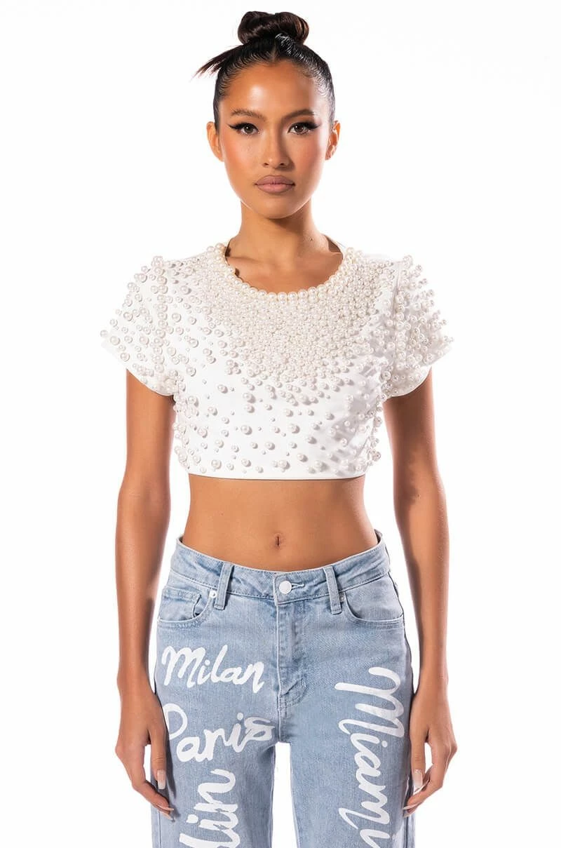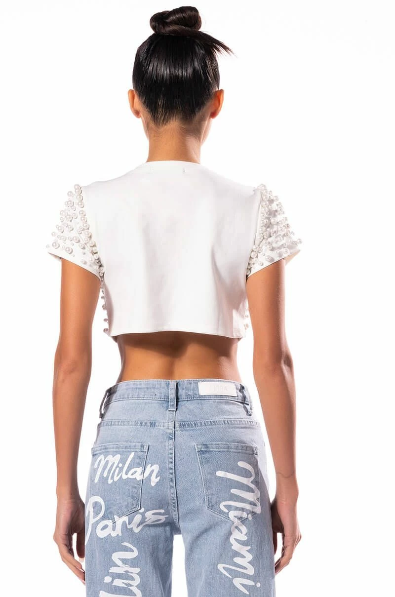 Bring the bling with The AKIRA Label Bling It On Embellished T Shirt. This stretch knit top features a rounded crew neckline, short cap sleeves, and an ultra-cropped cut. Complete with pearl beaded detailing throughout the front and sleeves. Pair with cargo pants and combat boots for a touch of feminine flair.