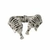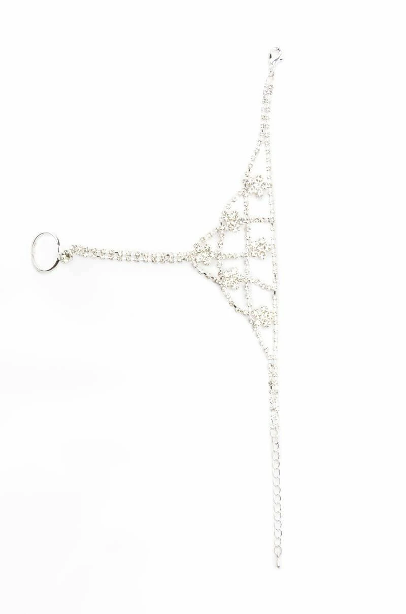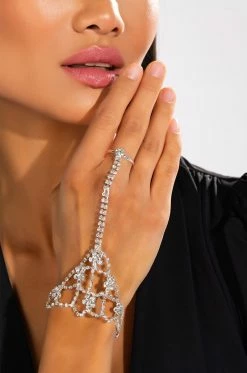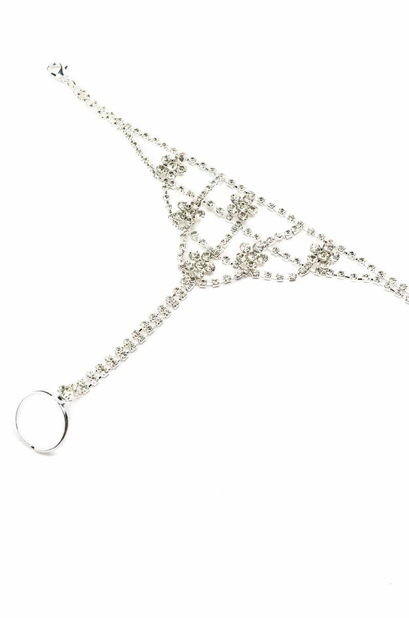 The AKIRA Label Blossoming Statement Hand Armor Bracelet is made from a faux silver metal base and features a flexible construction and intricate lattice-like design with rhinestone links. Complete with a cuff-style silhouette that travels along the hand, blossom-shaped rhinestone accents, and a single, adjustable middle finger rhinestone ring.