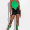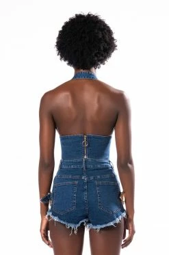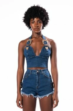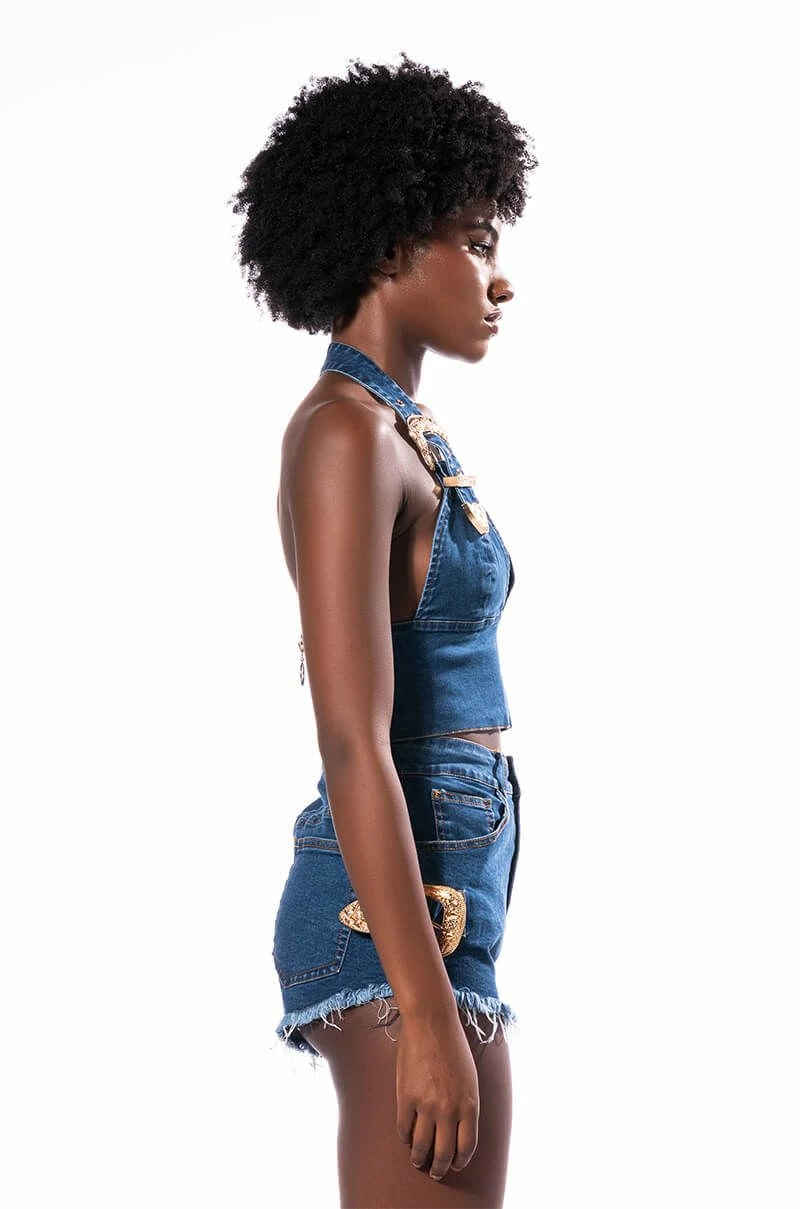 The AKIRA Label Blue Jean Baby Buckle Halter Crop Top is made from a soft stretch denim fabrication and features a halter silhouette with ornate metal belt and buckle details, rounded cups, a plunging neckline, a thick waistband, cropped length, open back, and an exposed back zipper closure with ring. Pair this piece with the coordinating AKIRA Label Blue Jean Baby Buckle Short and Western boots for a fierce denim look!