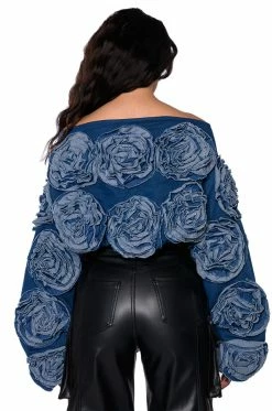 The AKIRA Label Bouquet Wishes Denim Off The Shoulder Sweatshirt is made from a structured denim fabrication and features an off the shoulder neckline, long, puffed sleeves, a cropped silhouette, and slick polyester lining. Complete with large, frayed denim rosettes. Pair this piece with wide leg bottoms and booties to finish off your blossoming look.