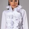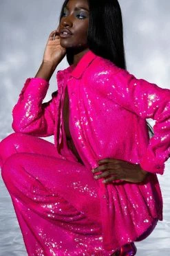 The AKIRA Label Bright Bright Pink Sequin Shirt features a mesh base, shimmer sequin detailing, a fold over collar, long sleeves, tonal button cuff detailing, a rounded hem, and a front button down closure, and a covered button front placket. Pair with the coordinating AKIRA Label Bright Bright Pink Sequin Trouser for a complete look.