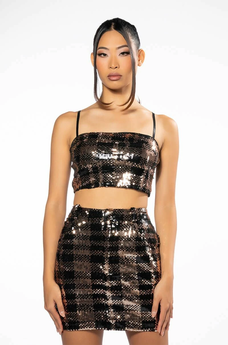 The AKIRA Label Bronze Queen Sequin Bralette is a glamorous piece featuring a polyester base, all-over sequin detailing, plaid print patterning, and slim adjustable tank straps. Complete with a bandeau-like cropped cut, an exposed back zipper closure, and a smooth inner lining. Pair this piece with the coordinating AKIRA Label Bronze Queen Sequin Mini Skirt and Blazer.