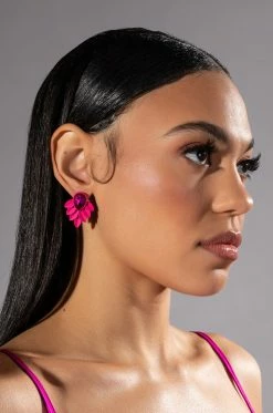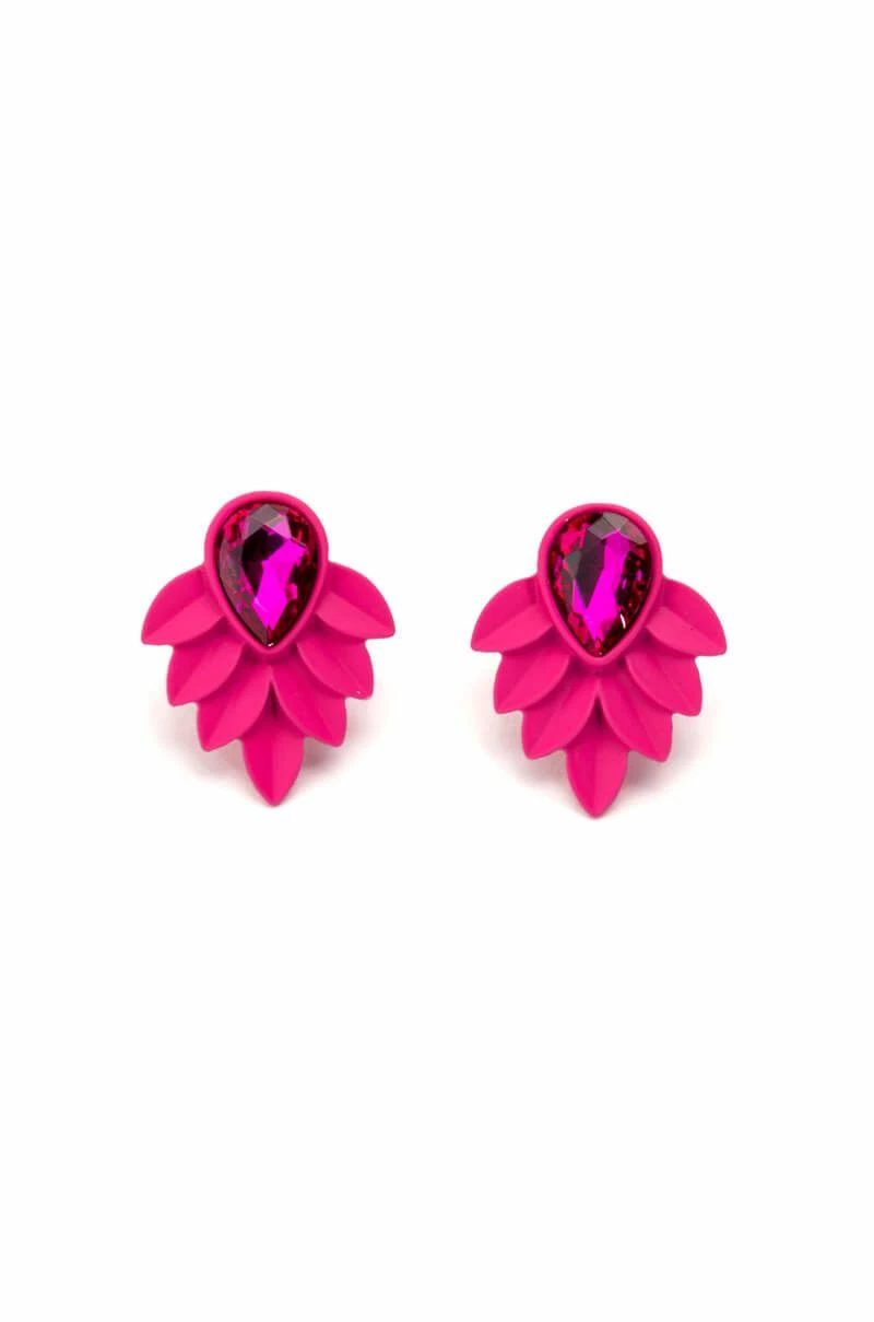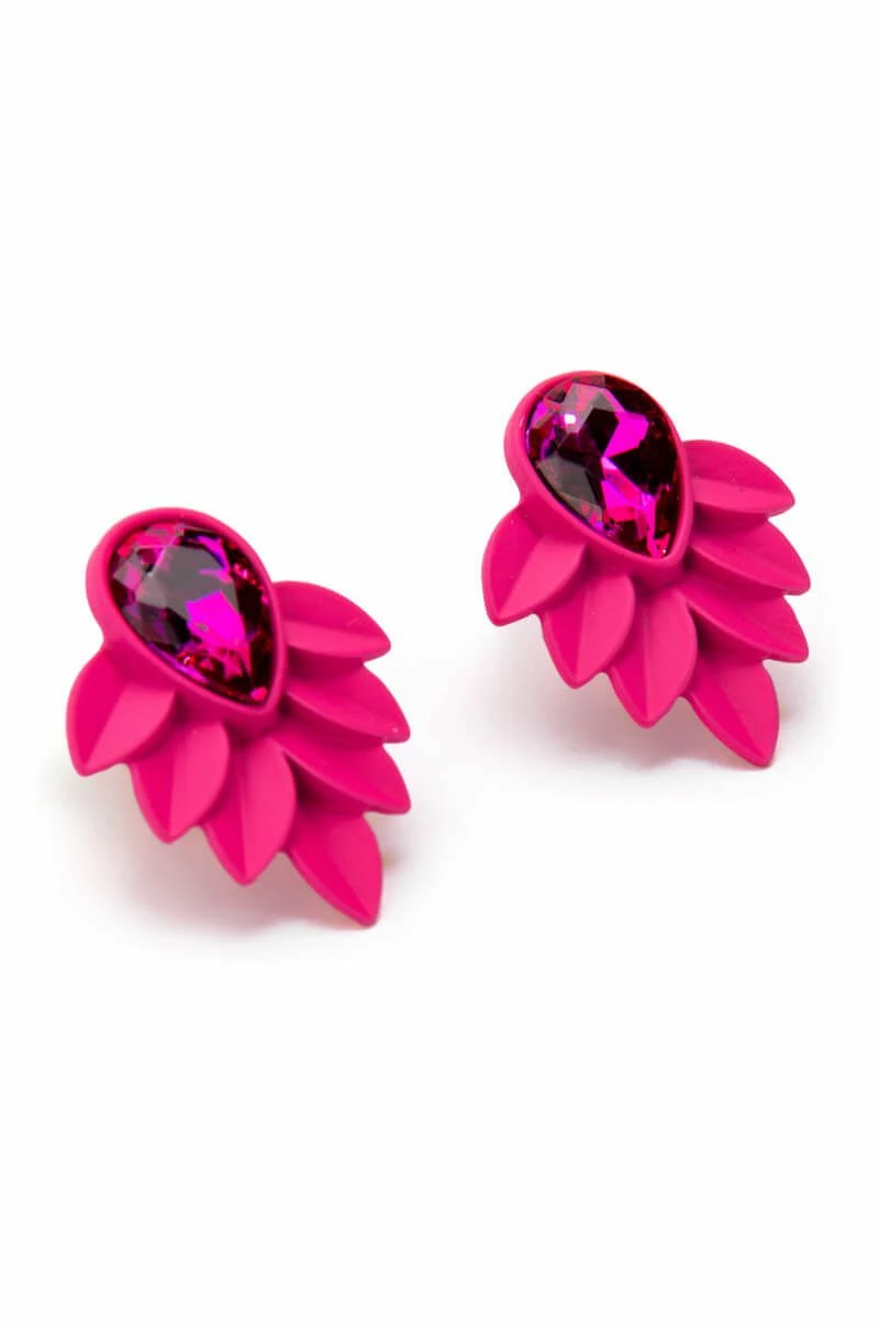 The AKIRA Label Butterfly Doors Statement Studs are made from a faux metal base and feature ornate leaf design posts with teardrop gems. Complete with post back-style closures.