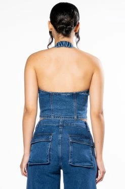 The Akira Label Calypso Denim Halter Neck Top is made from a stretch denim fabrication and features a halter neck silhouette, a cropped cut, and an exposed open back. Complete with a stunning western-style buckle front closure. Pair this piece with the coordinating AKIRA Label Calypso Mid Rise Wide Leg Jeans.