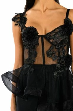 The AKIRA Label Camilla Floral Embroidered High Low Peplum Top features a luxurious mesh base fabrication, a sweetheart neckline with adjustable tank straps, and an asymmetrical peplum hemline. Complete with embroidered floral details and ruffled flower appliques, a corset bodice with boning for structure, a side high-low train silhouette, and an exposed silver metallic back zipper closure. Pair with skinny fit trousers and pumps for a chic, complete look.
