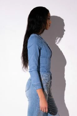The AKIRA Label Can’t Deny One Sleeve Denim Top is made from a stretchy denim fabrication and features an asymmetrical neckline with belt loop detailing, one long sleeve with a button cuff, a cropped silhouette, and a button and zipper front closure.