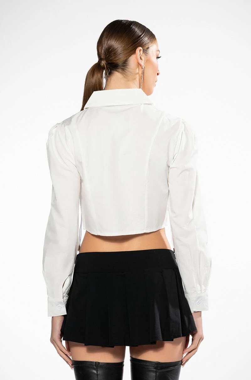 The AKIRA Label Carried Away Ruched Crop Zipper Blouse is made from a lightweight cotton and features a collared neckline, puffed shoulders, long sleeves with buttoned cuffs, ruched body detailing with drawstring toggles, pointed hems, and a cropped silhouette. Complete with a front zipper closure with a metal sparkle emoji pull.