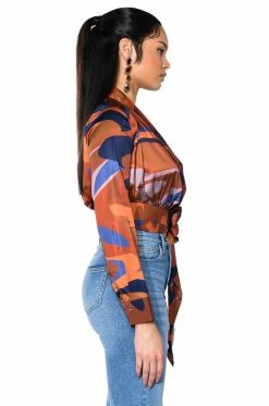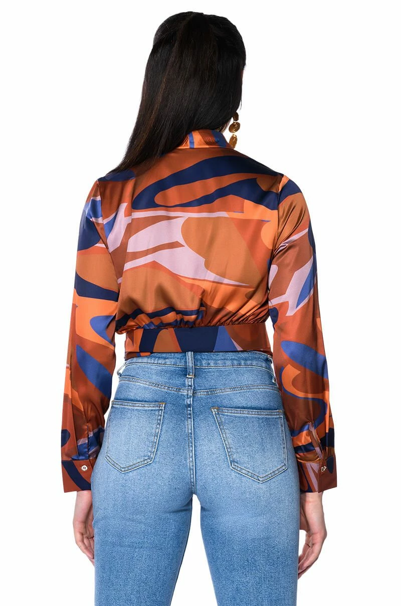 The AKIRA Label Casablanca Satin Printed Blouse is giving us date night on the beach vibes. Made from a luxe, satin base fabrication this ultra chic top features an abstract print design, a plunging neckline, foldover collar, and long sleeves with buttoned cuffs. Complete with a snap buttoned, self-tie side wrap closure. Style with denim jeans and stiletto booties for that effortlessly sexy look.