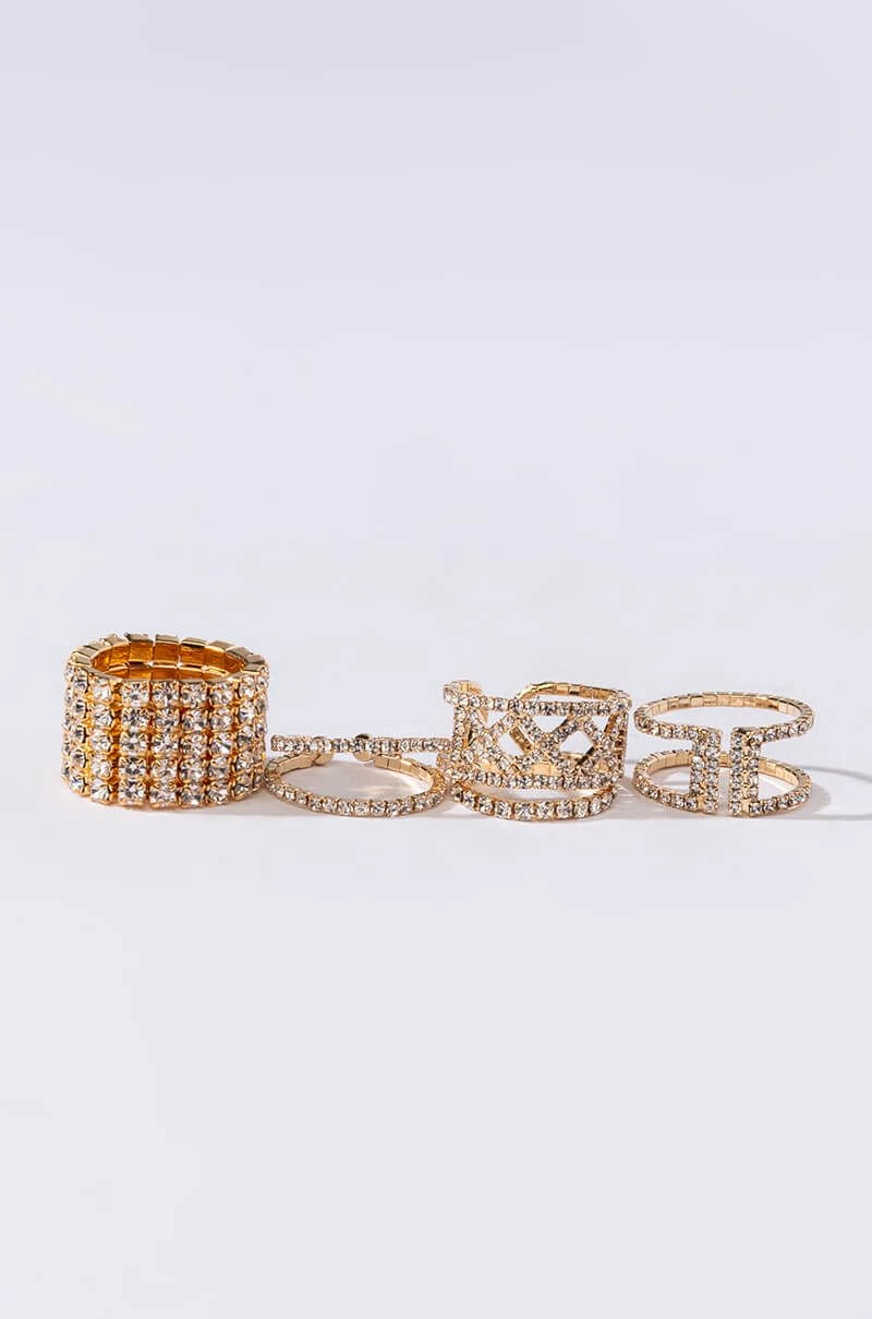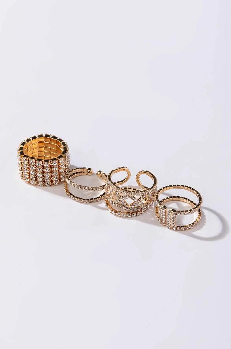 Set off your fresh mani with The AKIRA Label Check My Hands Ring Set. This collection of five faux gold rings features a stretchy multi-layer band, a single stretchy slim band, and three double rhinestone embellished pieces. Stack ‘em up or wear them individually to add some sparkle to your next going out fit!