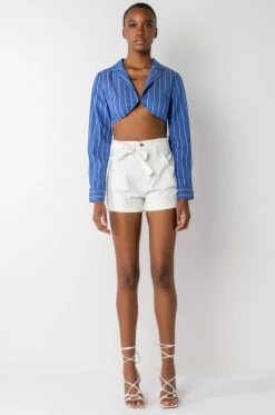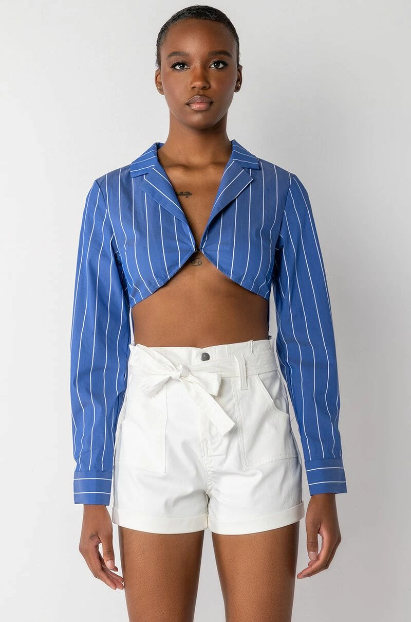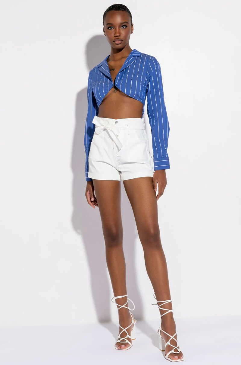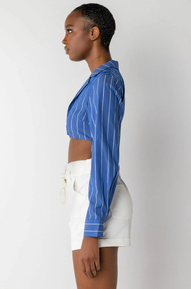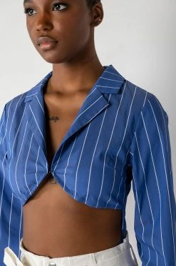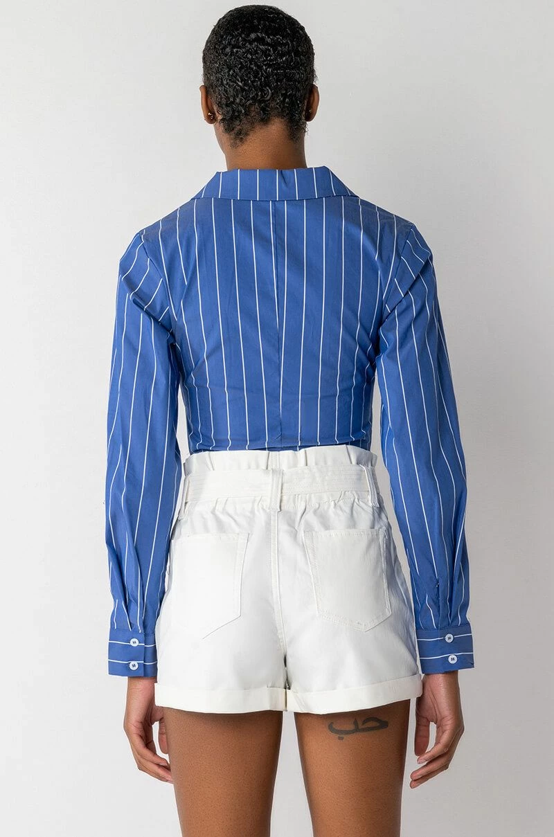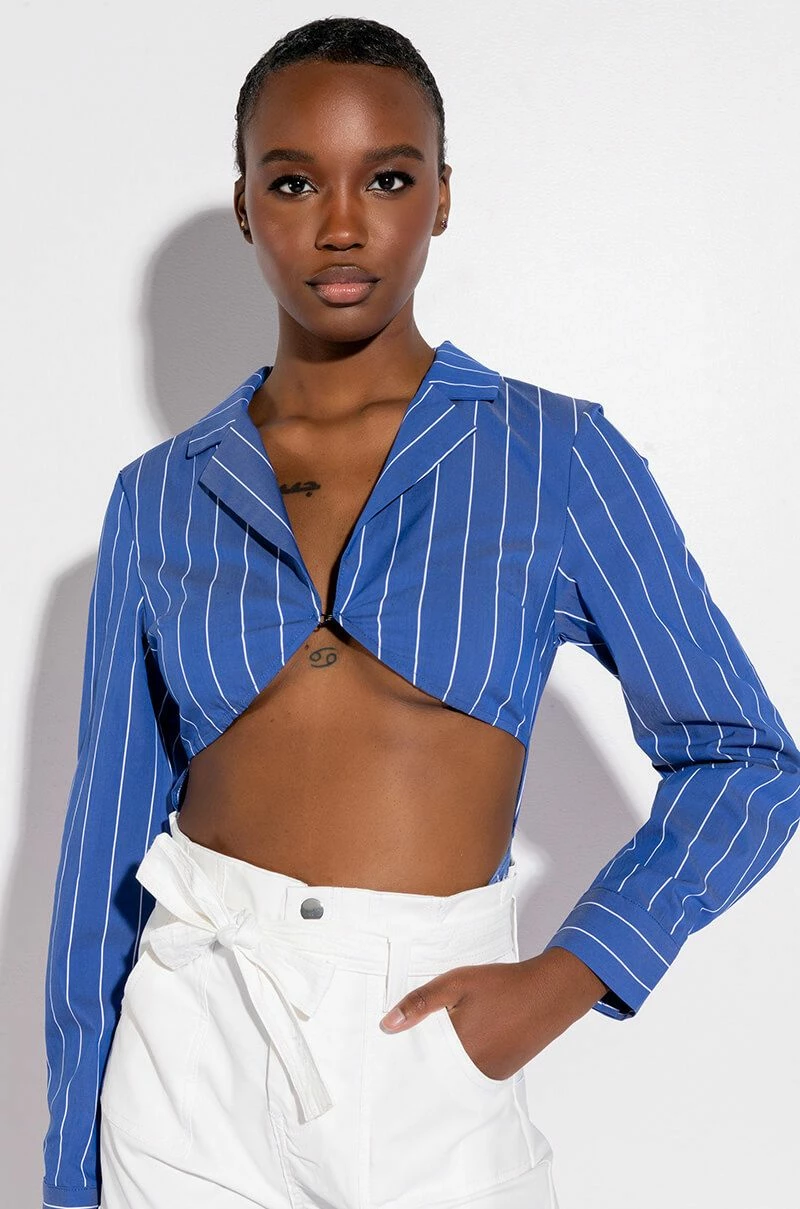 Serve executive realness in The AKIRA Label Circle Back Collared Bodysuit! This long sleeve piece is made from a light cotton blend and features striped print patterning, a notch collar neckline, long sleeves with button wrist details, a rounded, split hem, and a single front hook and eye closure. Complete with an attached mesh panty lining with a cheeky fit and snap gusset closure.