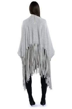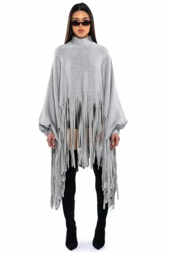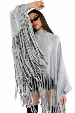 The AKIRA Label City Girl Fringe Sweatshirt is made from a slick, stretchy fabrication and features a mock neckline, long blouson sleeves with button cuffs, a poncho-like design, a cropped hem, and long fringe trim. Complete with an exposed back zipper closure.