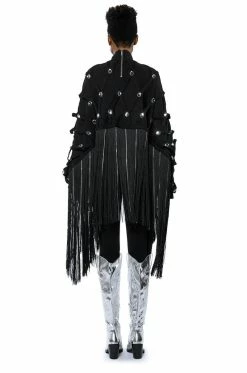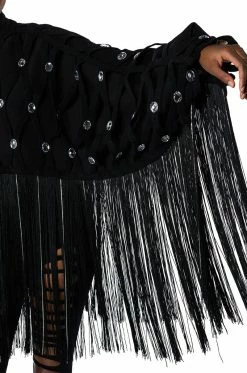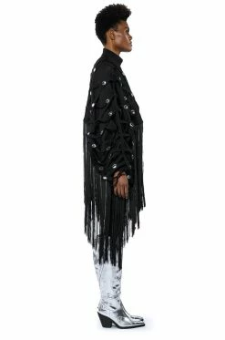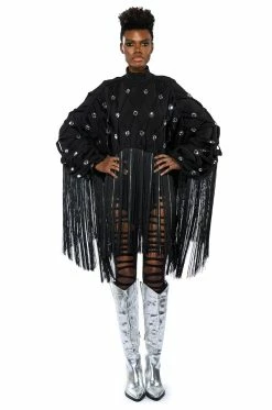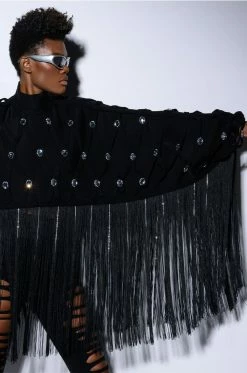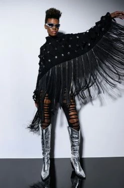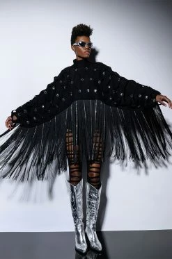 The AKIRA Label City Livin Fringe Sweatshirt is made from a soft knit fabrication and features a standing collar, long, poncho-like sleeves with snap button cuffs, a knit, webbed top layer with gem detailing, a cropped silhouette, a long rhinestone link fringe hem, and a quarter zip front closure.
