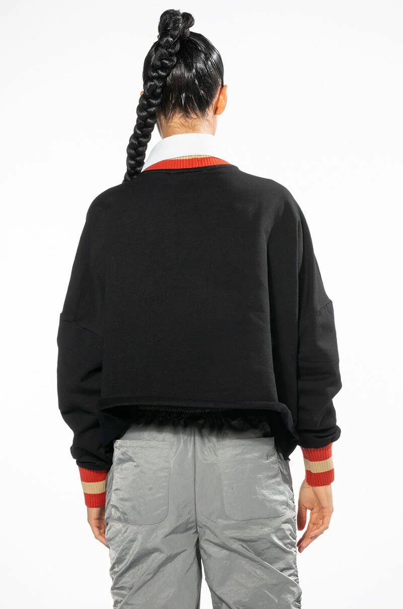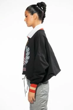 The AKIRA Label Collegiate Haute Academy Collared Sweatshirt is a cozy, cute sweater featuring a smooth knit fabrication, long sleeves, ribbed knit cuffs, a raw hem cropped cut, and a contrast collared neckline. Complete with a rhinestone embellished “Haute Academy,” collegiate logo graphic.