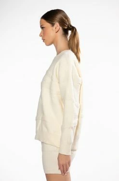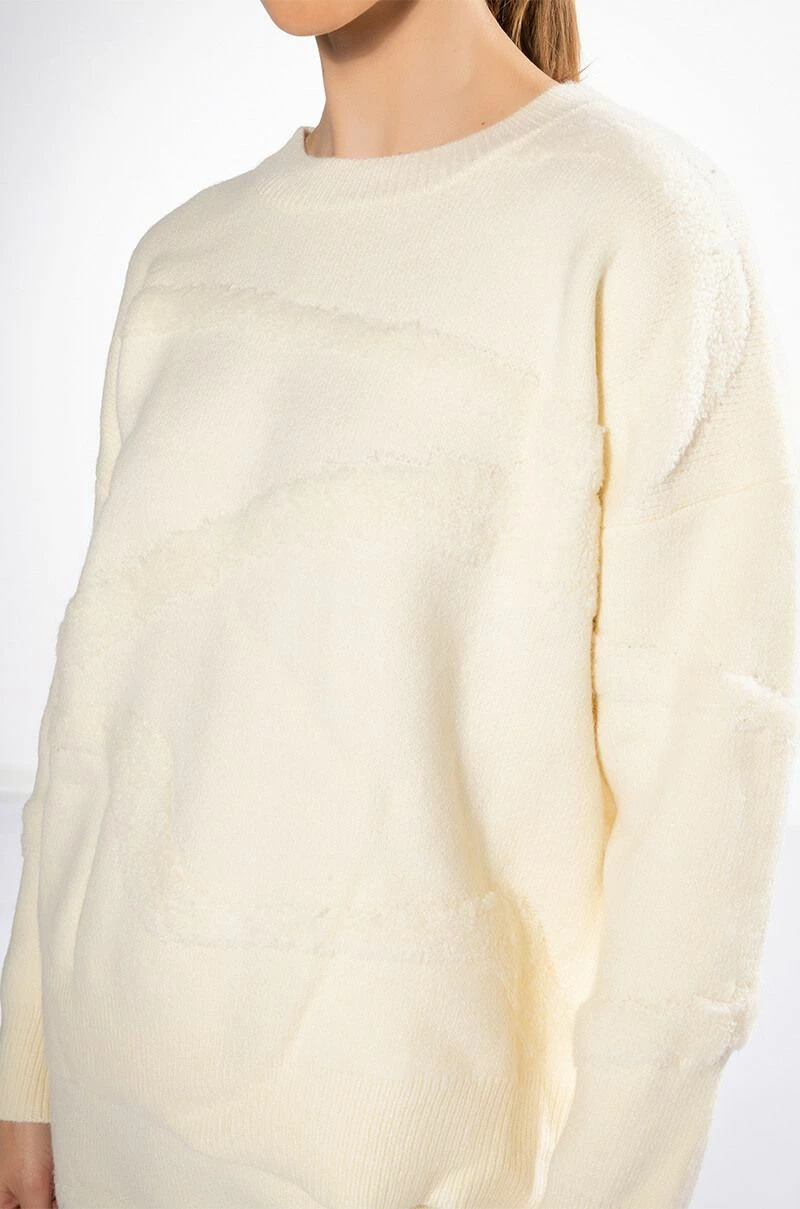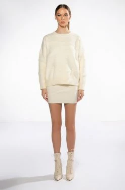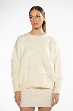 The AKIRA Label Comin In Hot Crew Neck Sweater features a fuzzy knit fabrication, a crew neckline, long sleeves, abstract, textured stripe paneling, an oversized silhouette, and ribbed knit hems. Pair this piece with the matching AKIRA Label Comin In Hot Knit Mini Skirt to complete your cozy look.