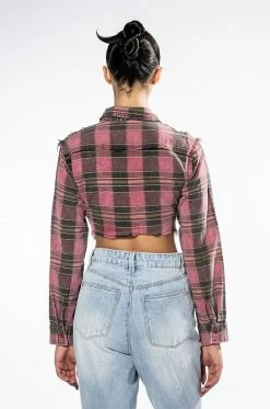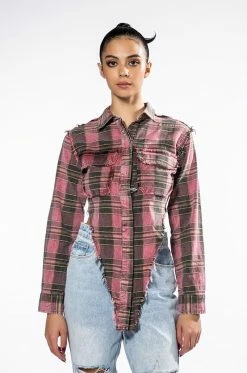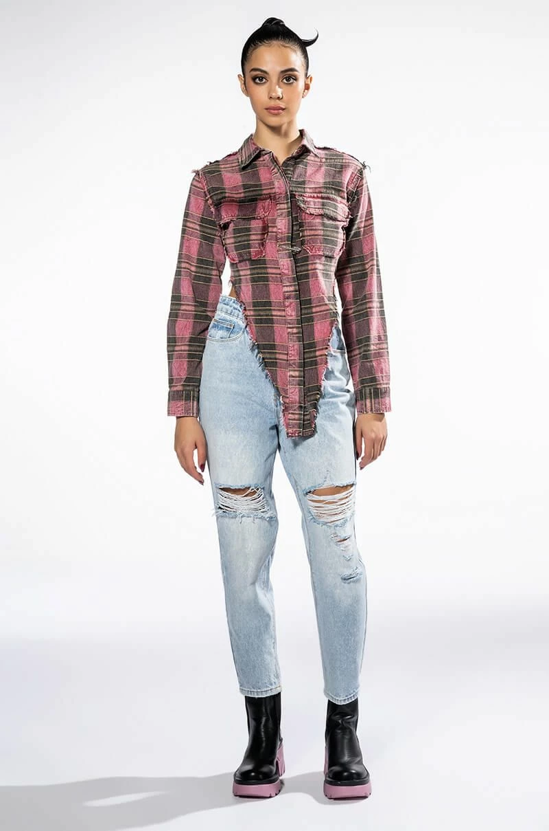 The AKIRA Label Cool Again Flannel Blouse features a washed cotton flannel fabrication, a plaid print colorway, a collared neckline, long sleeves, button cuffs, flap front chest pockets, a high low hem, and a single rhinestone-embellished safety pin front closure. Complete with raw hem trim. Pair this piece with distressed denim, a cropped tank, and combat boots for a textured grunge look.