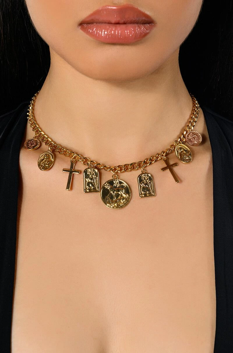 The AKIRA Label Count Your Blessings Charm Necklace is made from a faux gold base and features a curb chain link design, choker silhouette, various gold charms, and an adjustable lobster claw closure.
