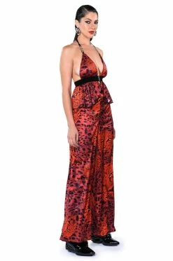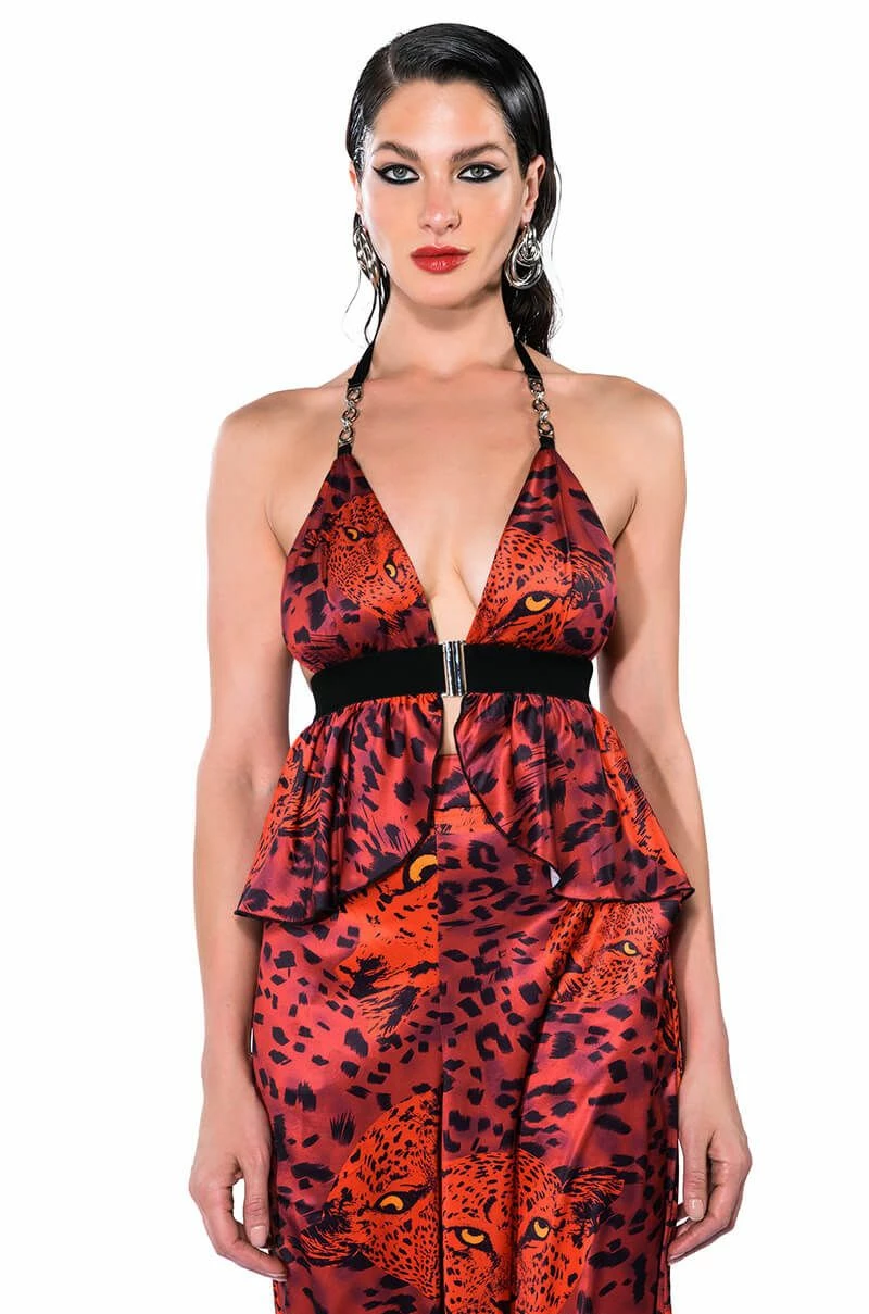 The AKIRA Label Craving Your Attention Halter Top is made from a soft satin fabrication and features a fierce cheetah print with floating cheetah heads, a tie halter with embellished chain detailing, a plunging neckline, a wide, buckled elastic waistband, a sexy open back, and a rounded, peplum-like hem. Pair this piece with the matching AKIRA Label Craving Your Attention Wide Leg Pants to keep all eyes on you.