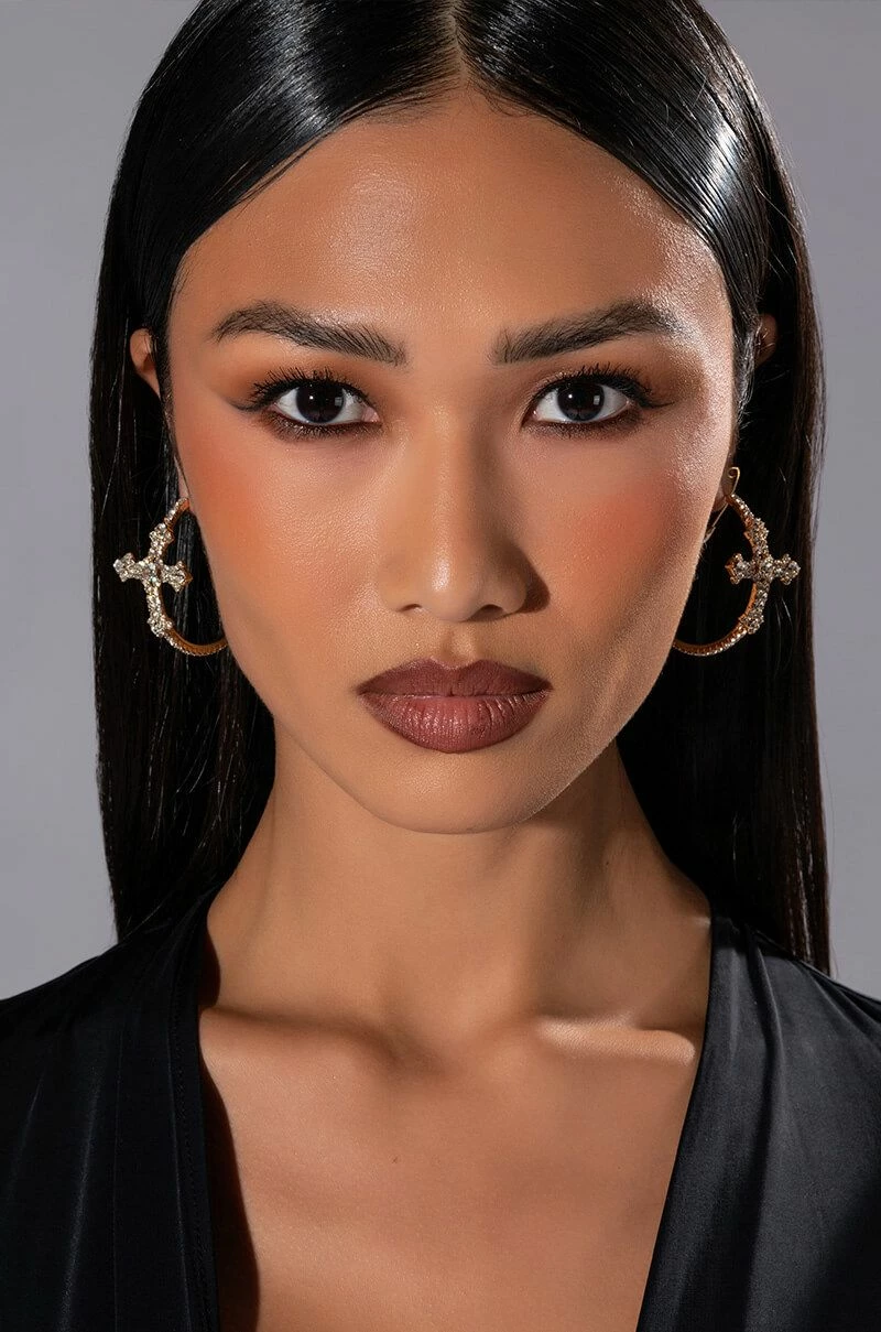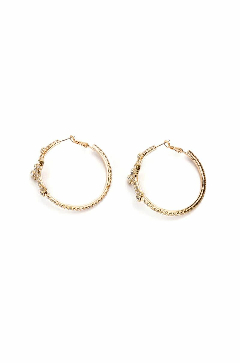 The AKIRA LabelCross My Heart Embellished Hoops are an oversized hoop earring featuring a faux gold base, rhinestone-embellished detailing, sculptural cross accents, and a latch-back fastening.