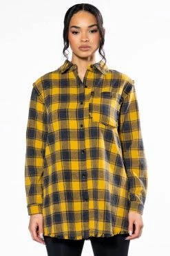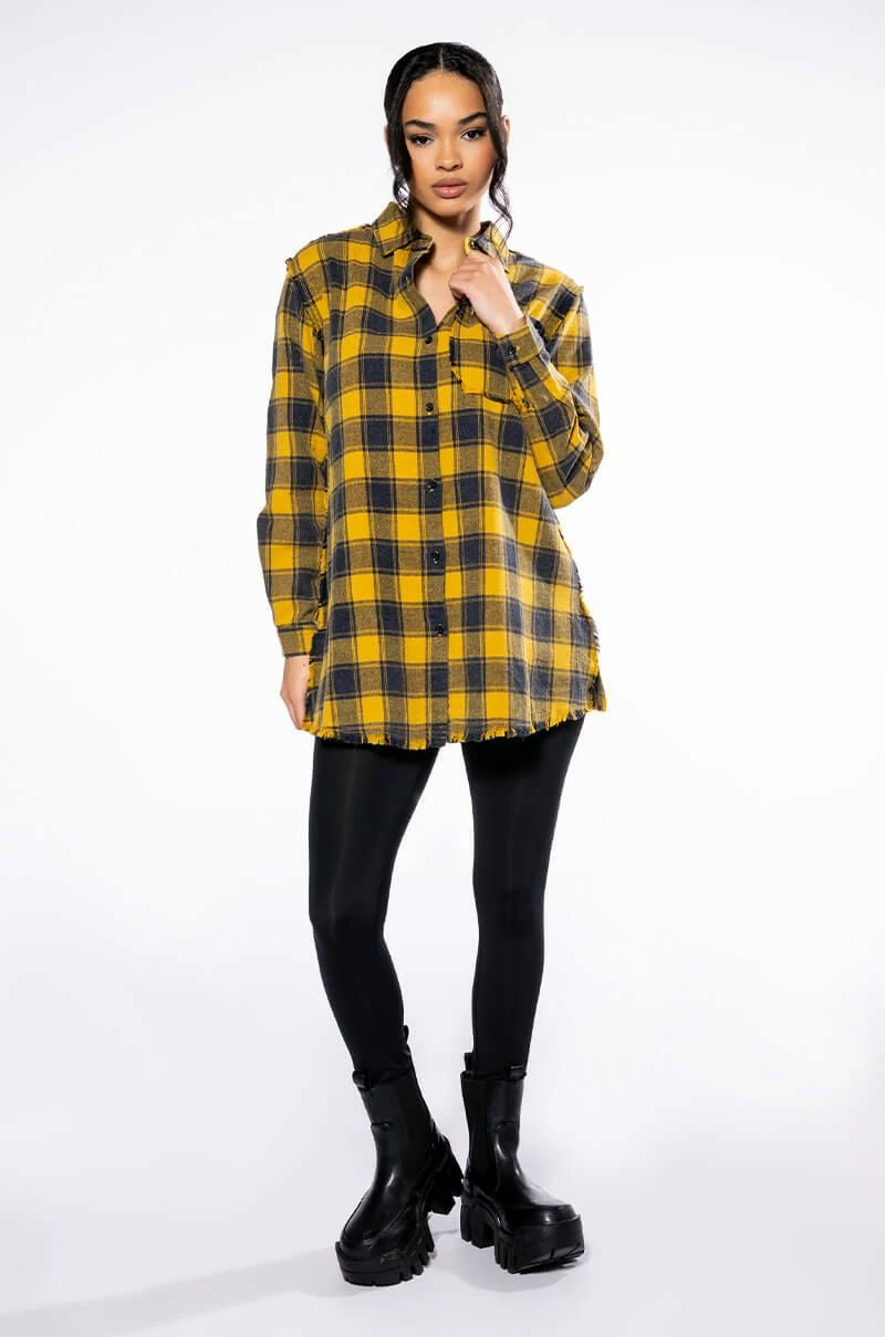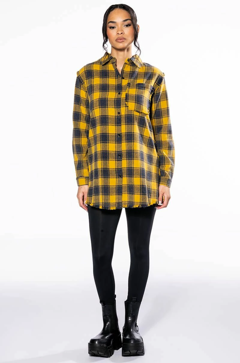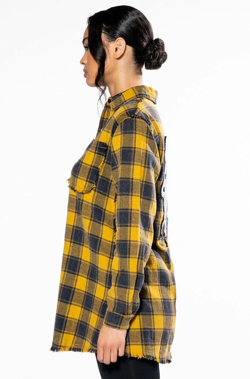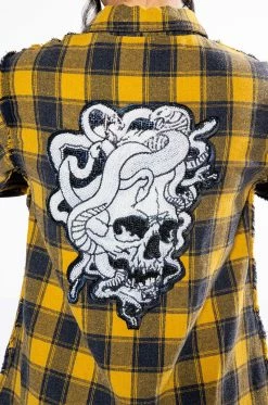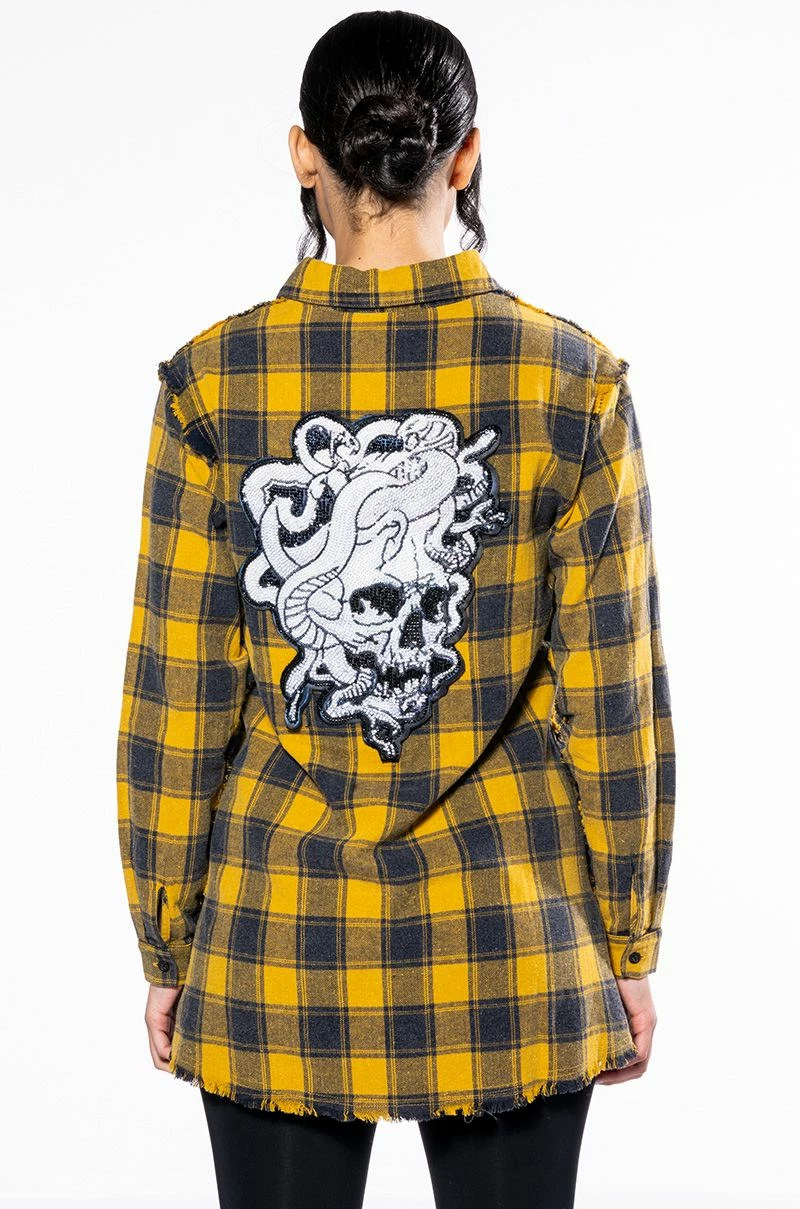 The AKIRA Label Dark Fantasy Button Down Flannel is made from a cozy flannel fabrication and features a collared neckline, long sleeves with buttoned cuffs, distressed detailing, a chest patch pocket, a longline silhouette, and a large, beaded Medusa skull back patch. Complete with a button down front closure. Pair this piece with leather-look leggings and combat boots to complete your fantasy look.
