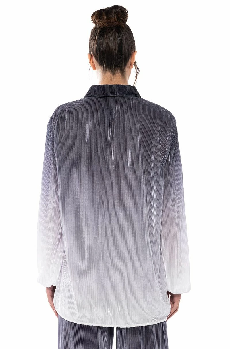 The AKIRA Label Day To Night Pleated Satin Button Down In Black White is a lightweight pleated satin piece featuring long sleeves with elastic cuffs, a front button down enclosure with fly front, a foldover pointed collar, and a plunging neckline. Complete with a longline silhouette and an oversized design. Style this flowy piece with the coordinating bottoms, The AKIRA Label Day To Night Pleated Satin Wide Leg Pants In Black White, for a luxe lounge look.