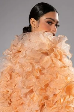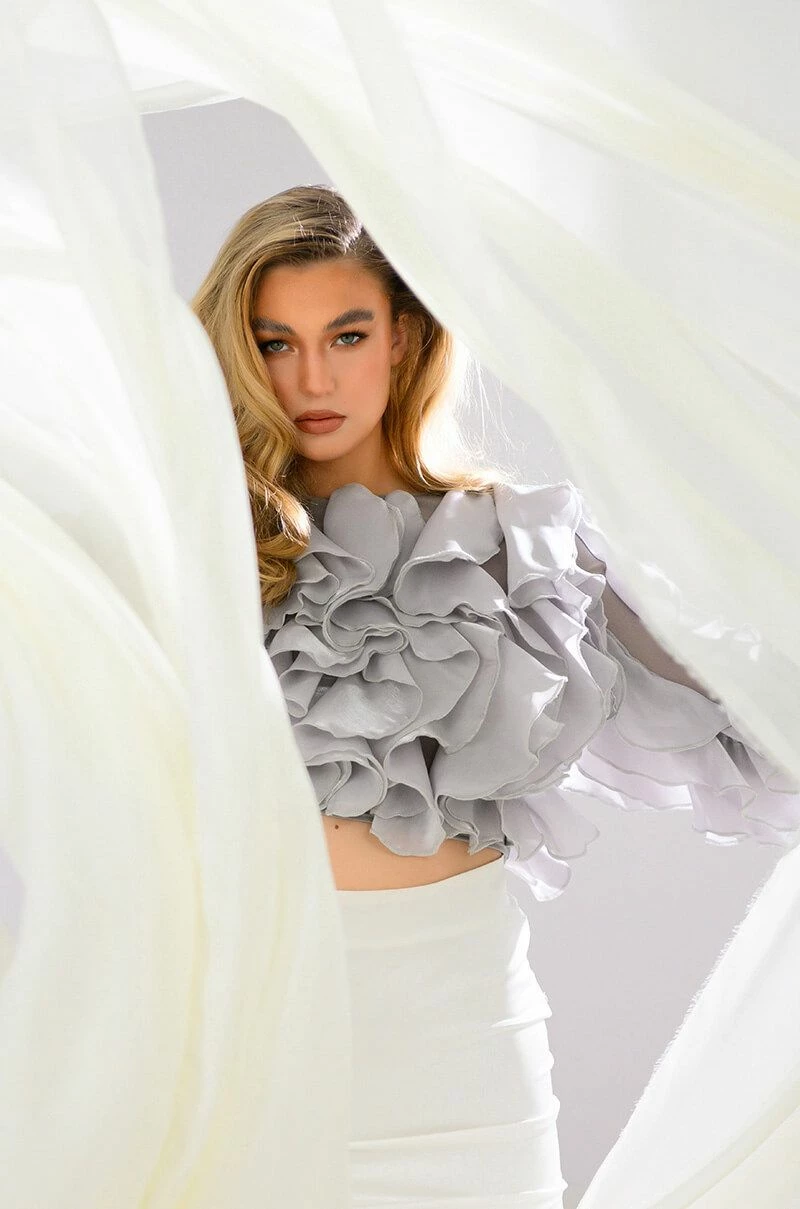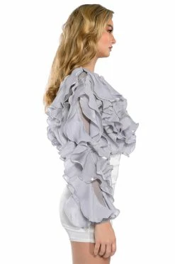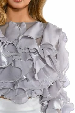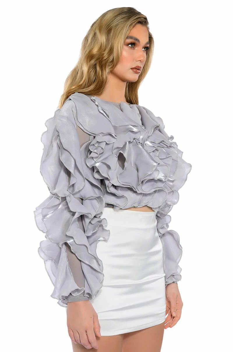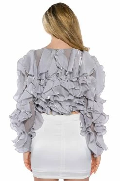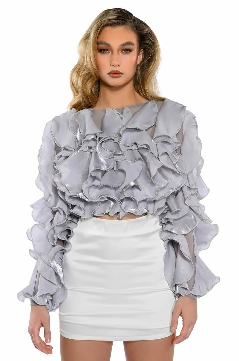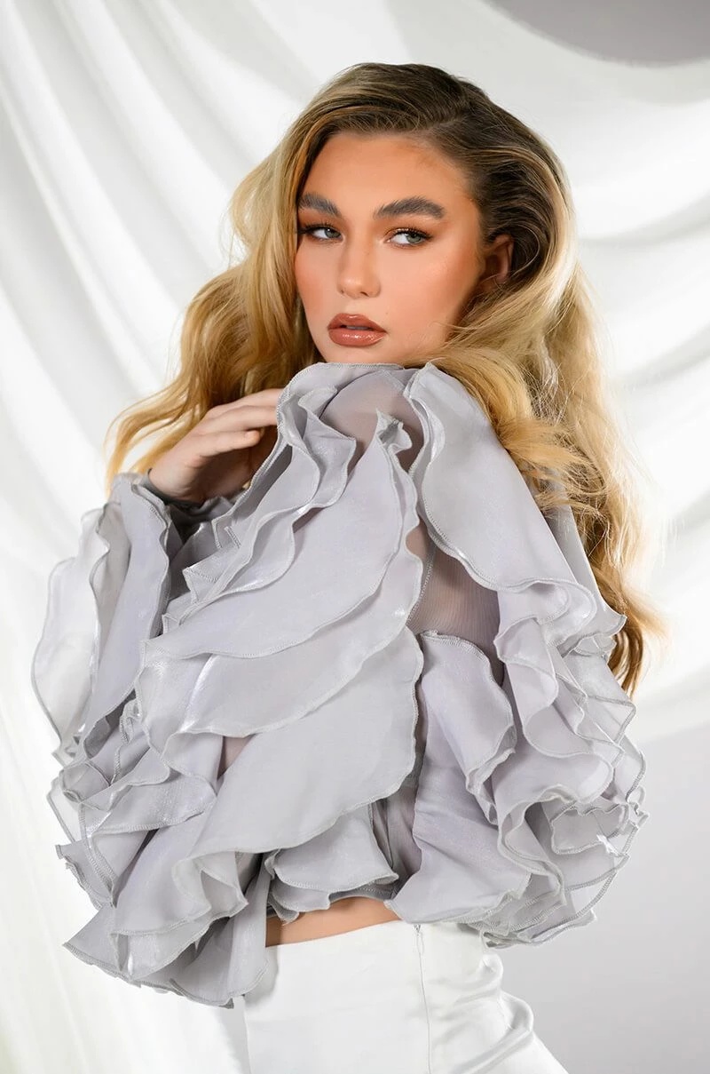 The AKIRA Label Delicate Petals Sheer Ruffle Long Sleeve Blouse features a sheer mesh fabrication, dramatic organza cascading ruffles, and long sleeves. Complete with a crew neckline, a cropped cut. and a keyhole back with a single button closure. Pair with a bodycon midi skirt and lace up sandals.