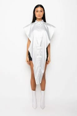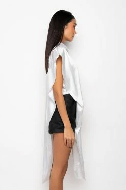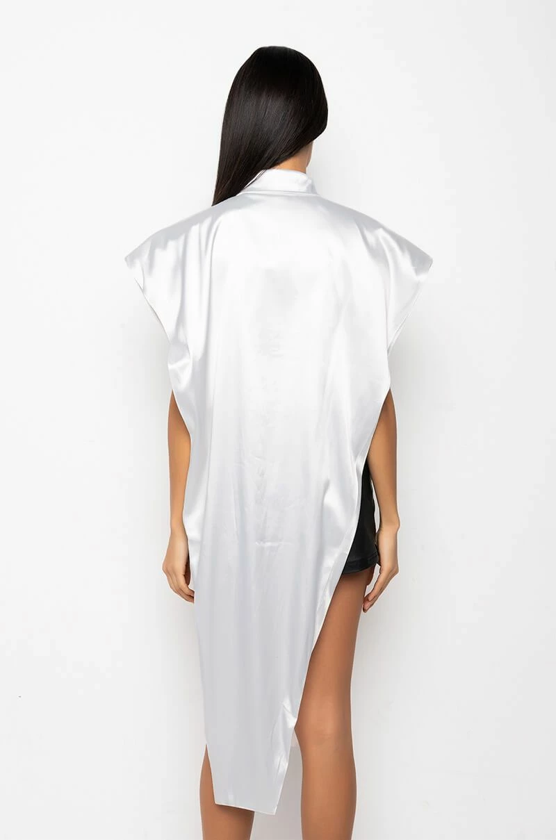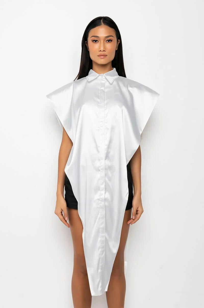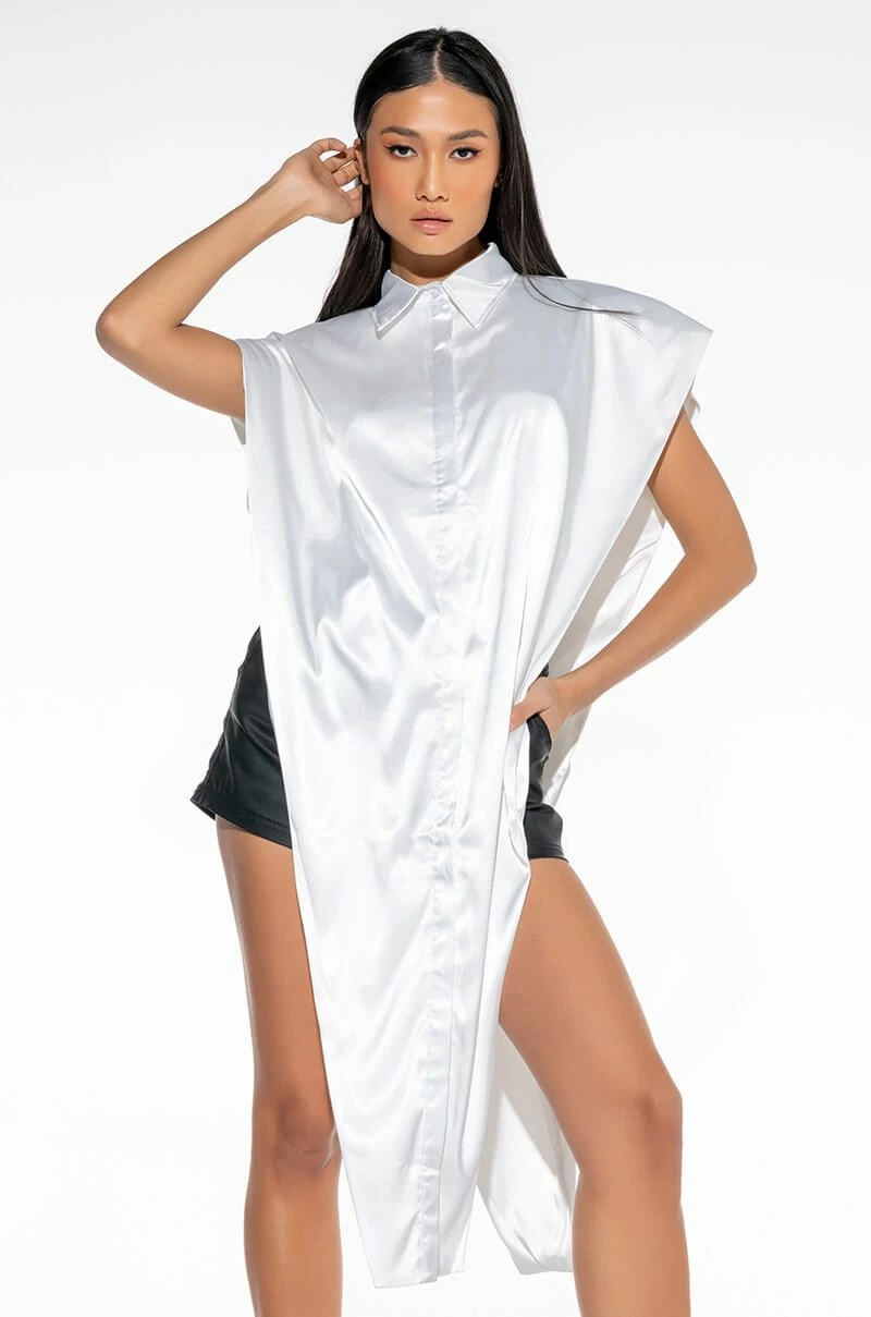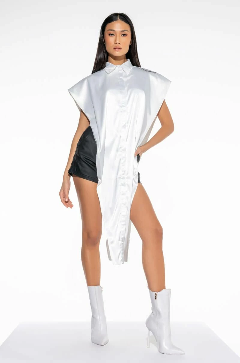 The AKIRA Label Desire Maxi Button Up Blouse features a sleeveless silhouette, wide shoulder details, a button up front, an inner cropped tank, an extended front detail, and a collared neckline.