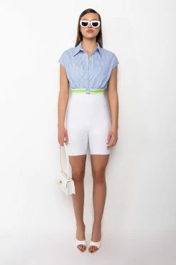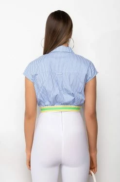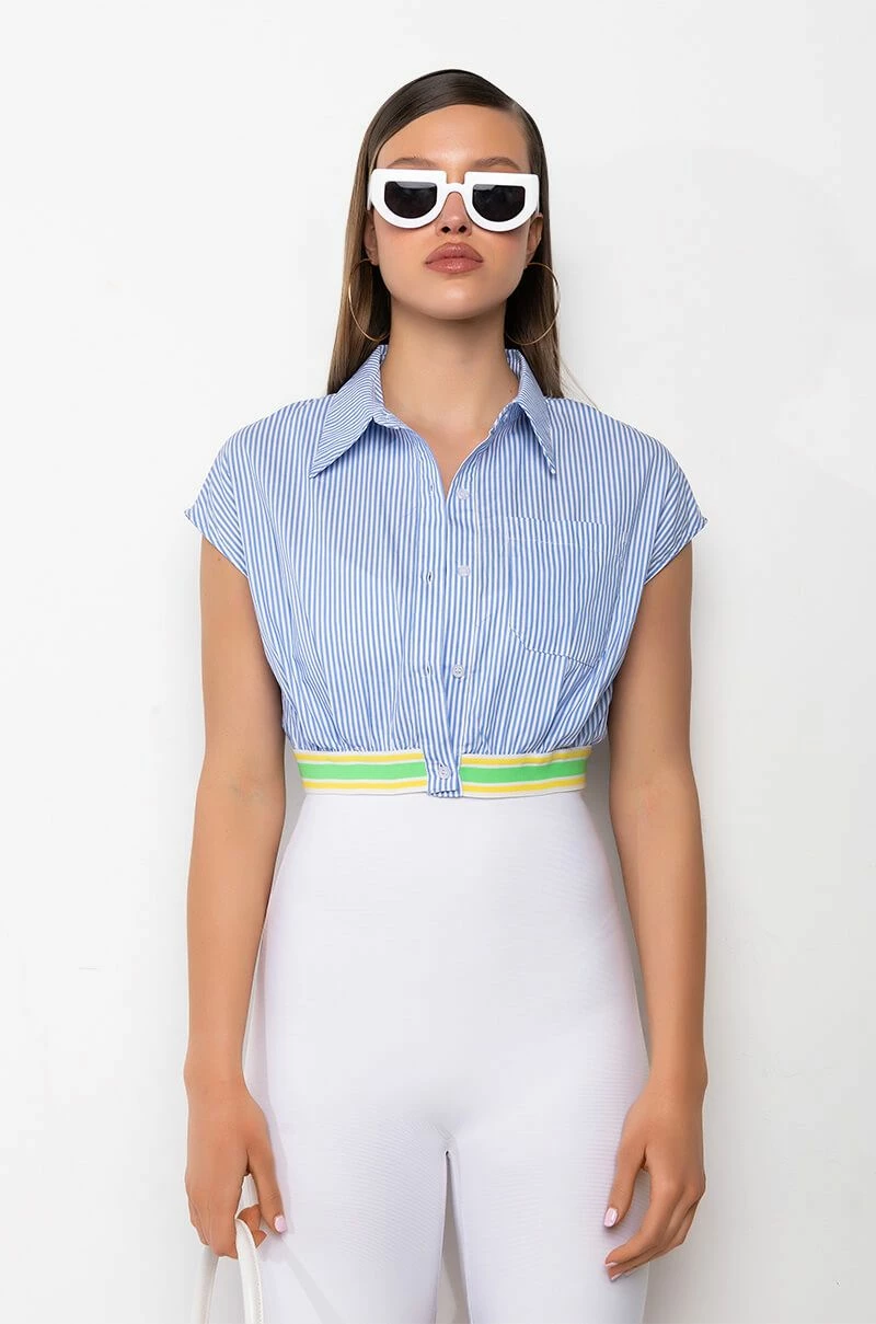 The AKIRA Label Dirty Martini Cropped Short Sleeve Poplin Blouse is made from a classic cotton shirt fabrication and is complete with a collared neckline, cap sleeves, striped pattern, a chest patch pocket, a thick multicolor elastic waistband, cropped silhouette, and a button up front closure. Pair this piece with flared bottoms for a flirty cocktail hour look!