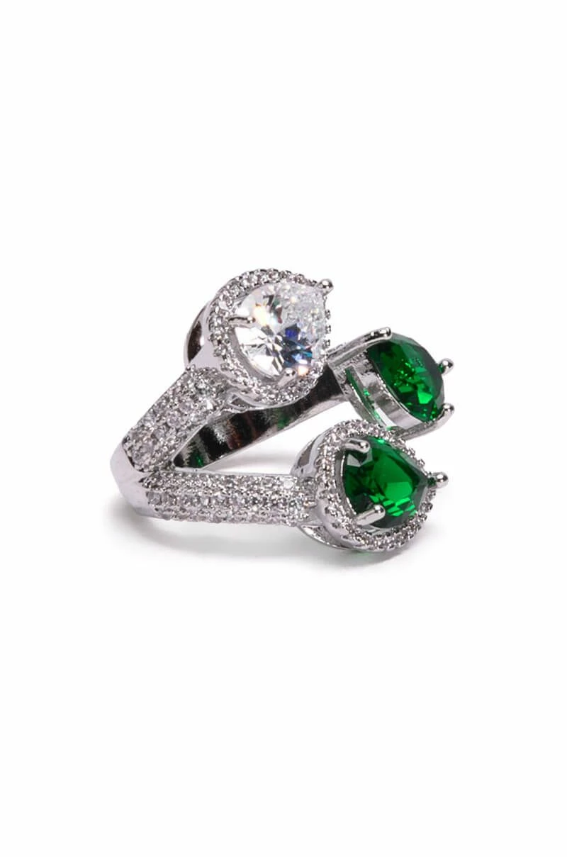 The AKIRA Label Dirty Martini Rhinestone Cocktail Ring is made from a faux silver metal base and features a single rhinestone-detailed split band with three rhinestone-trimmed clear and green teardrop gems.
